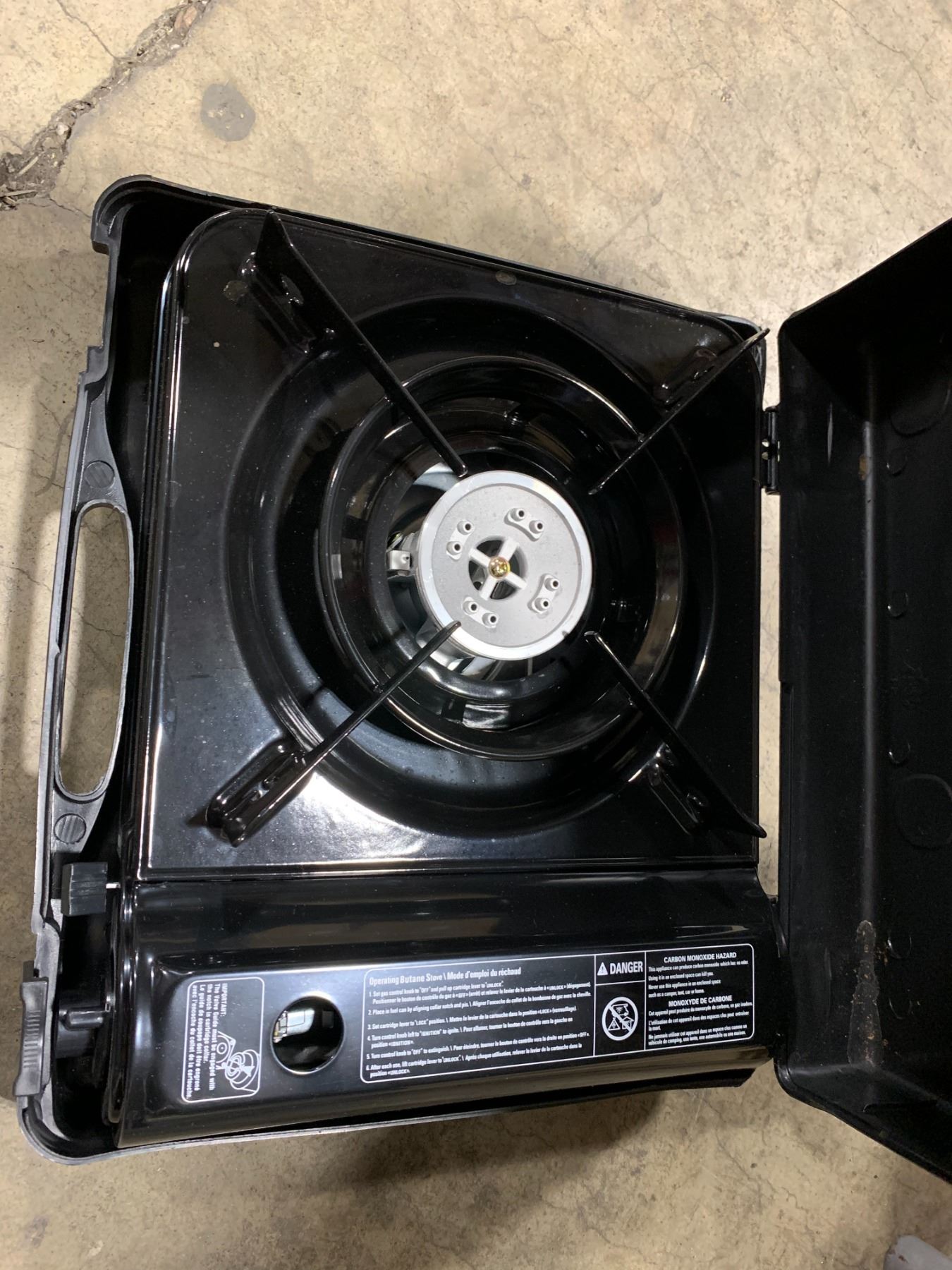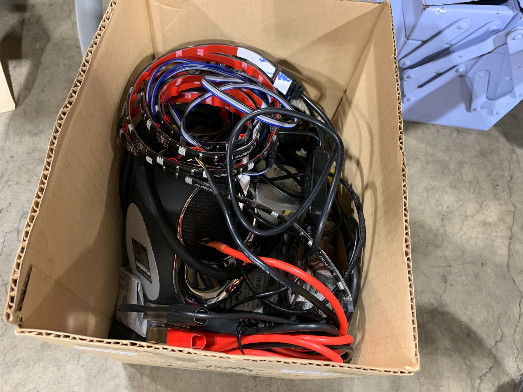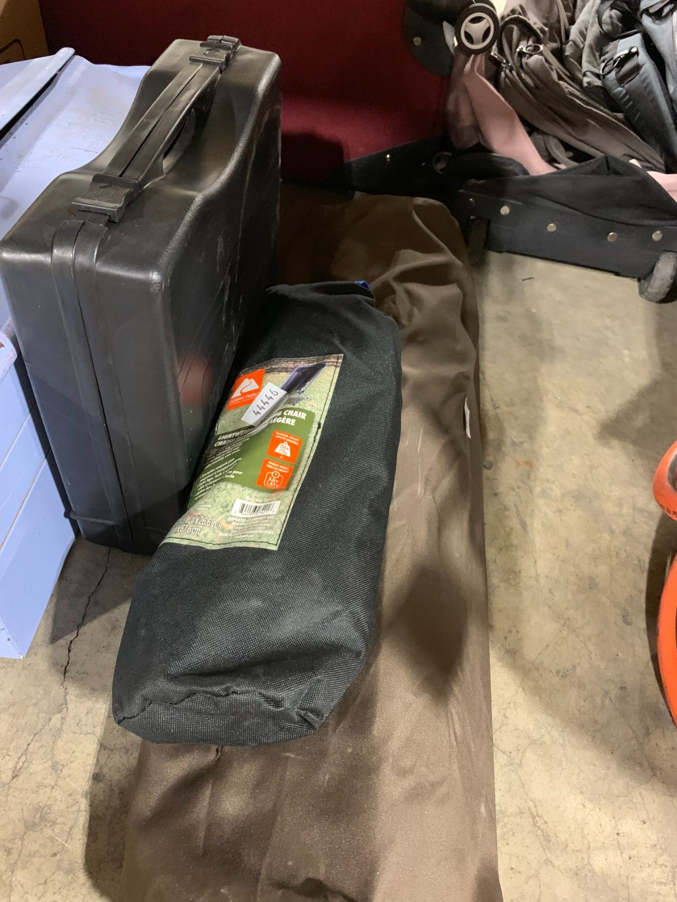 LOT OF ASSORTED CAMPING GEAR, STOVE, CHAIR, METAL HAND CARRY TOOLBOX, 2 BOXES OF ELECTRONICS,