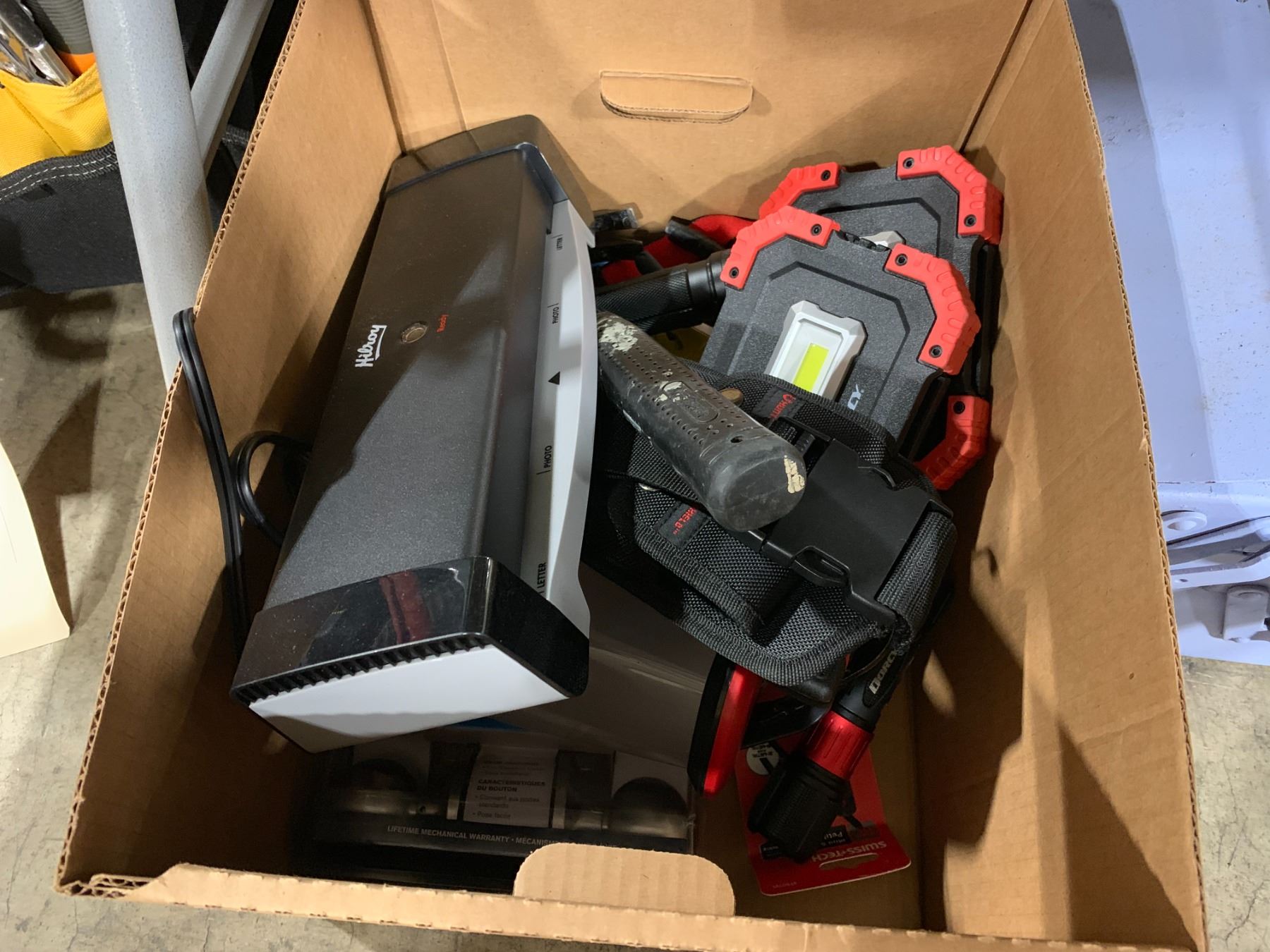LOT OF ASSORTED CAMPING GEAR, STOVE, CHAIR, METAL HAND CARRY TOOLBOX, 2 BOXES OF ELECTRONICS, FLASHLIGHTS, HUNTING KNIFE, LAMINATING MACHINE & MISC