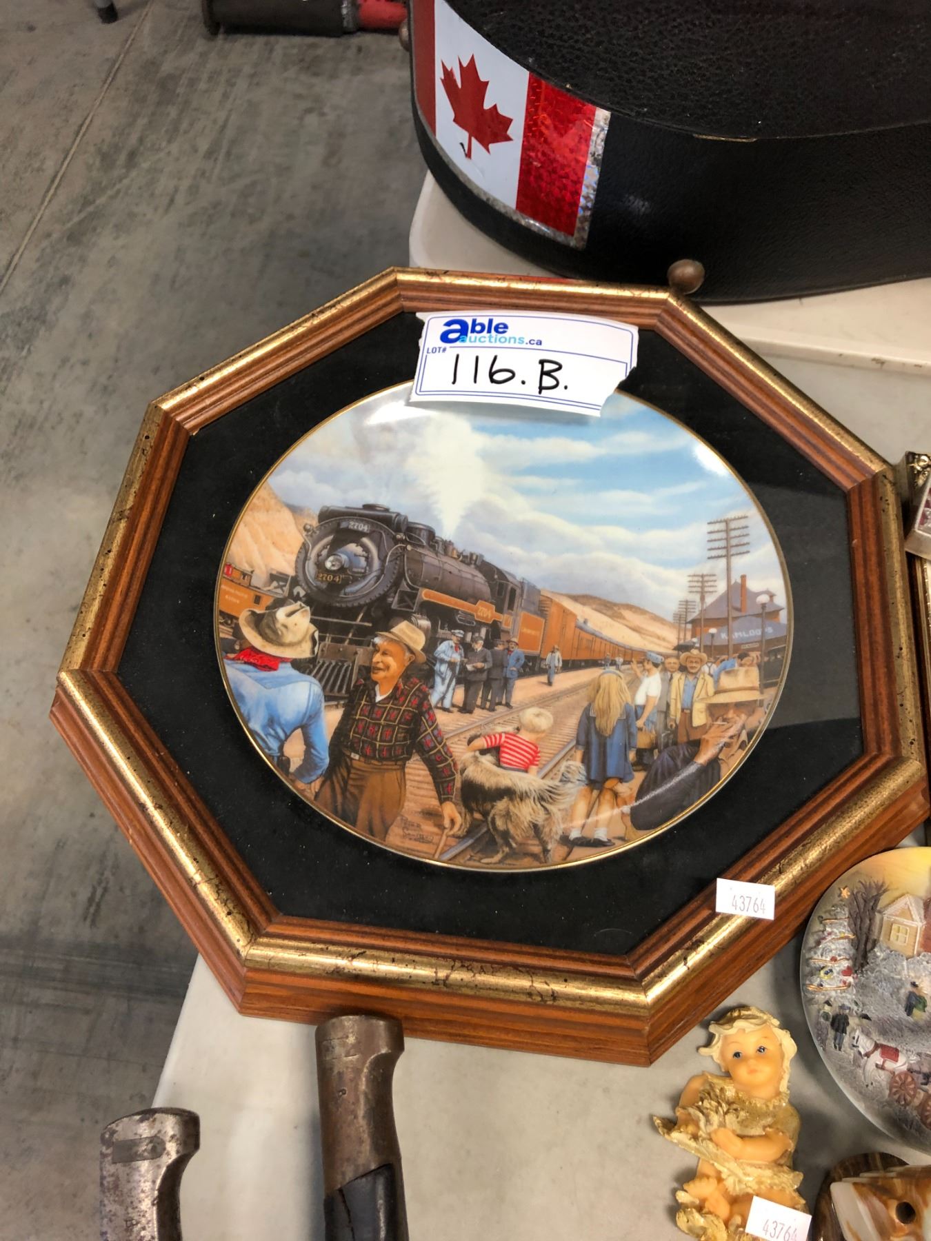 LOT OF ASSORTED COLLECTIBLES INCLUDING FRAMED ANTIQUE PETER SAWATZKY PAINTED PLATE, SOUVENIR