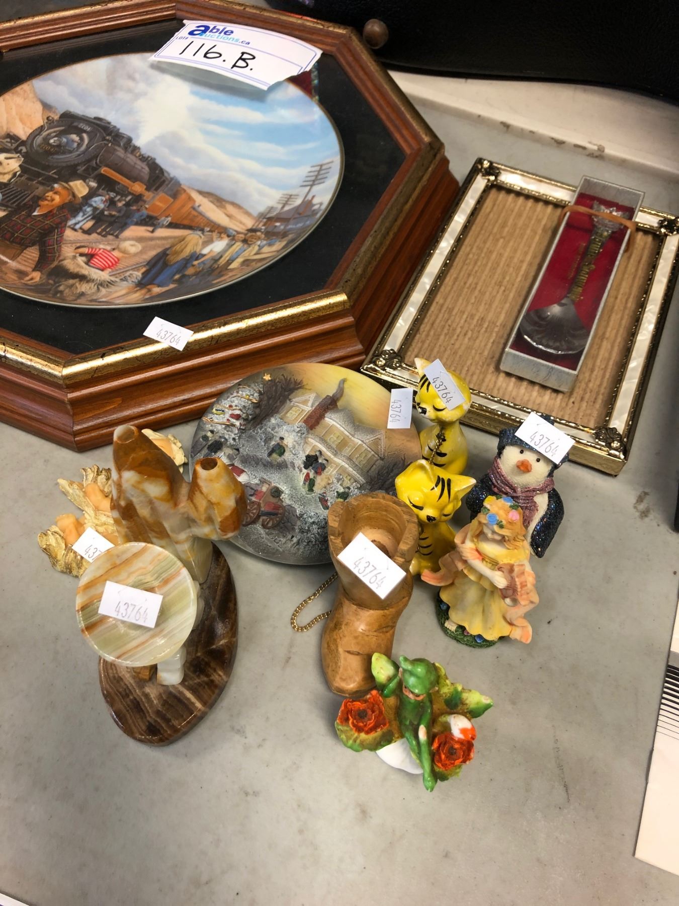 LOT OF ASSORTED COLLECTIBLES INCLUDING FRAMED ANTIQUE PETER SAWATZKY PAINTED PLATE, SOUVENIR ENGLISH SPOON, PICTURE FRAME AND ASSORTED FIGURINES