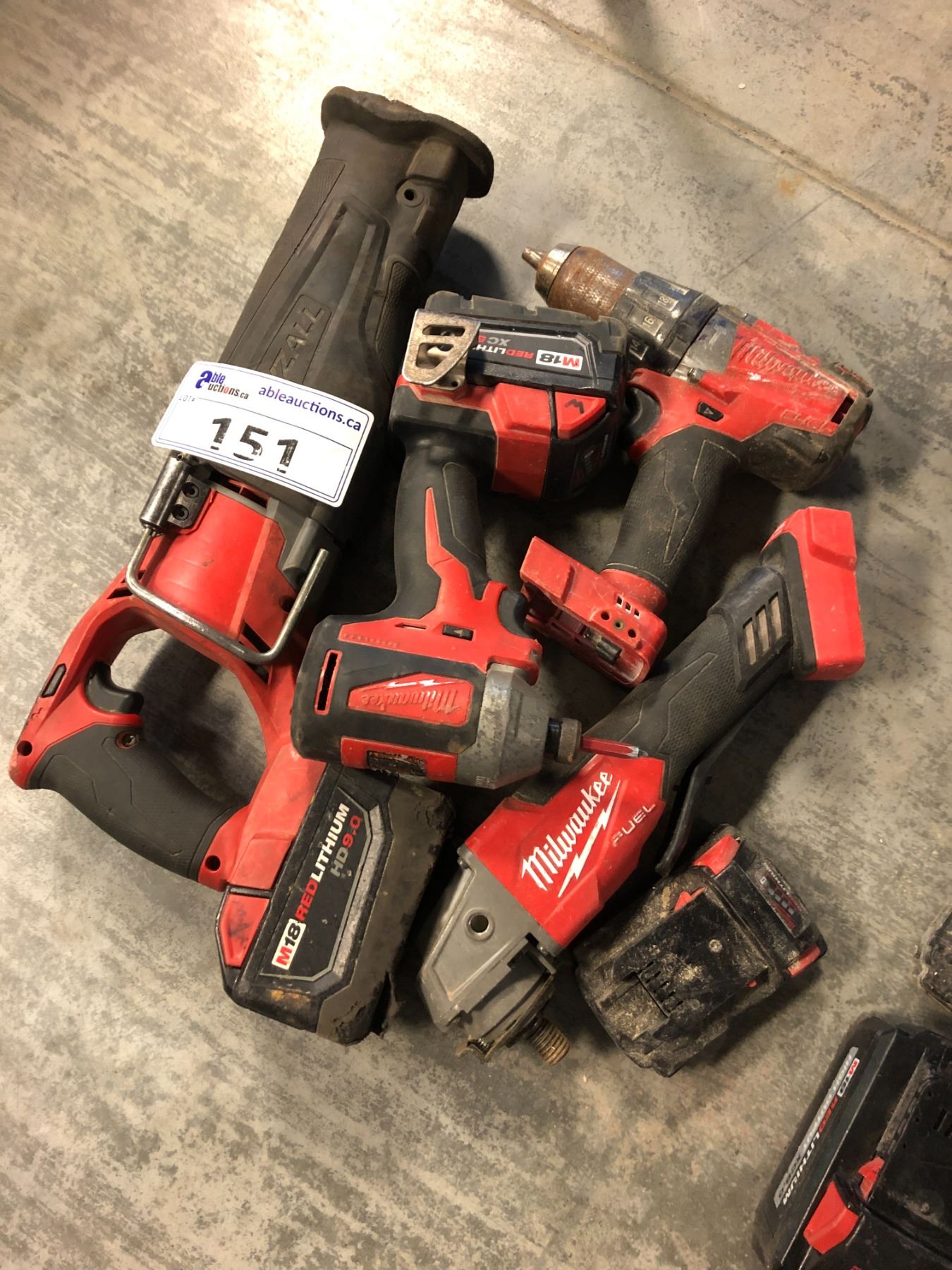 LOT OF ASSORTED CORDLESS MILWAUKEE POWER TOOLS INCLUDING IMPACT, DRILL, ANGLE GRINDER. SAWZALL AND 3 BATTERIES