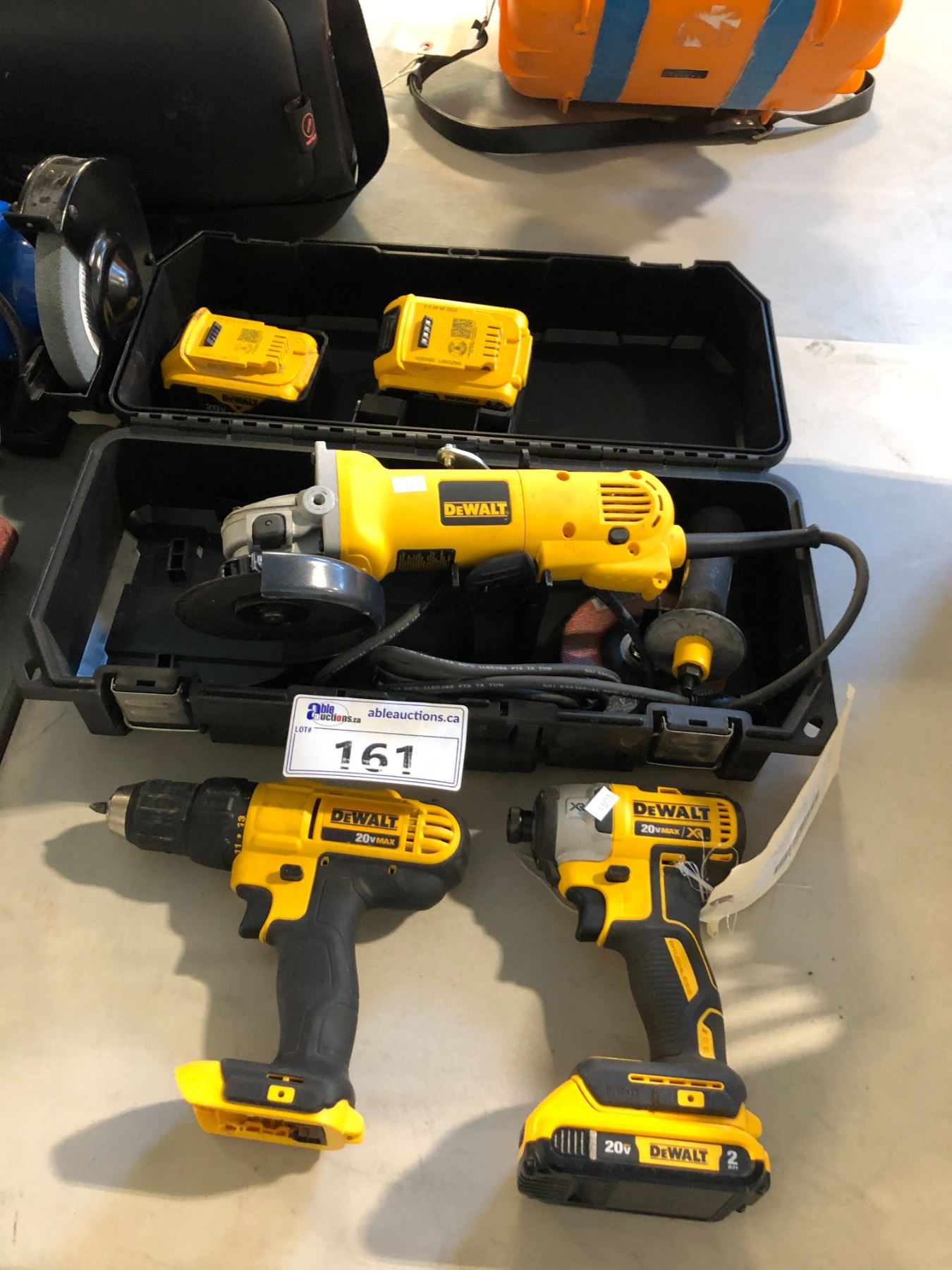 LOT OF ASSORTED DEWALT POWER TOOLS INCLUDING ELECTRIC ANGLE GRINDER, CORDLESS IMPACT DRIVER, CORDLESS DRILL, 3 BATTERIES AND HARD CARRY CASE