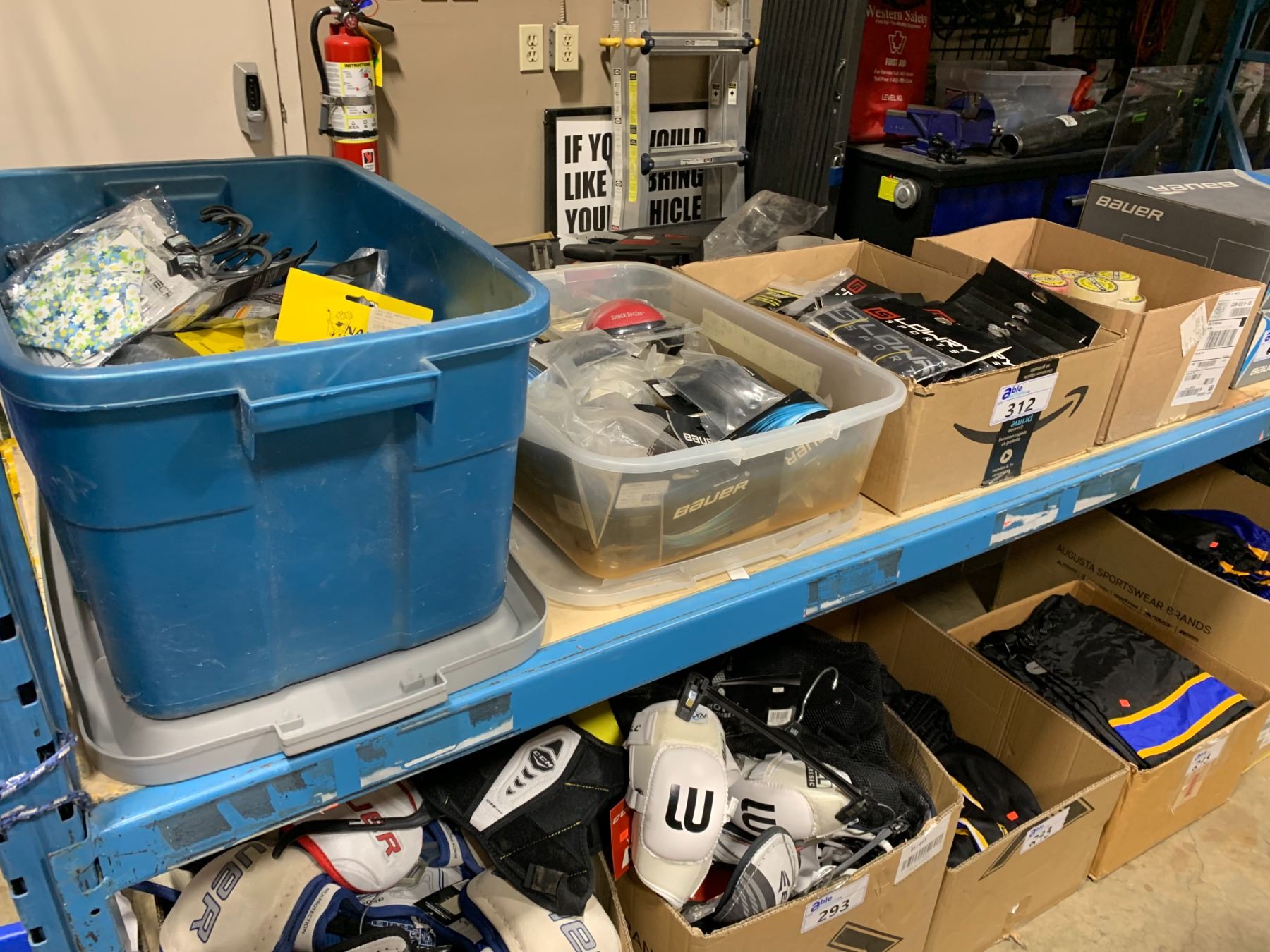 LOT OF ASSORTED HOCKEY PUCKS, GARTER BELTS, SHOCK DOCTOR CHIN CUPS, FACE MASKS & KNEE LIFTS