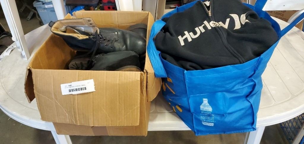 LOT OF ASSORTED HOODIES - SMALL MEDIUM AND LARGE AND ASSORTED SHOES AND LEATHER BOOTS