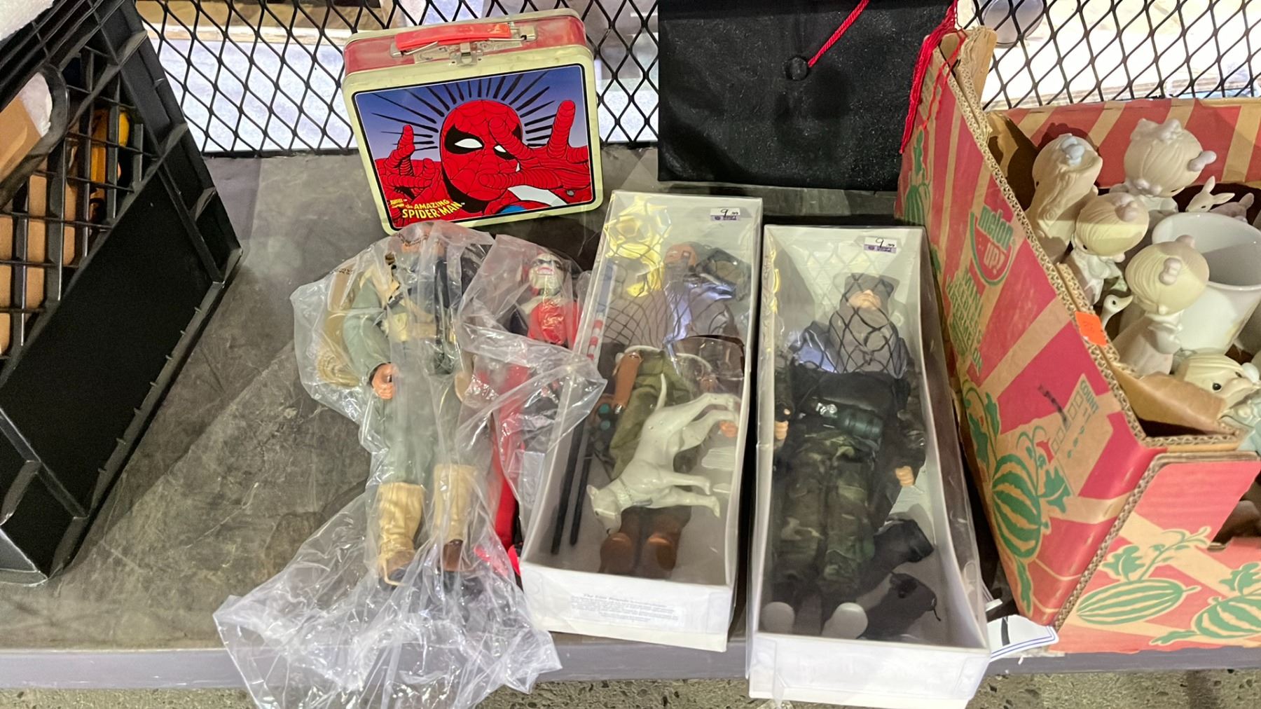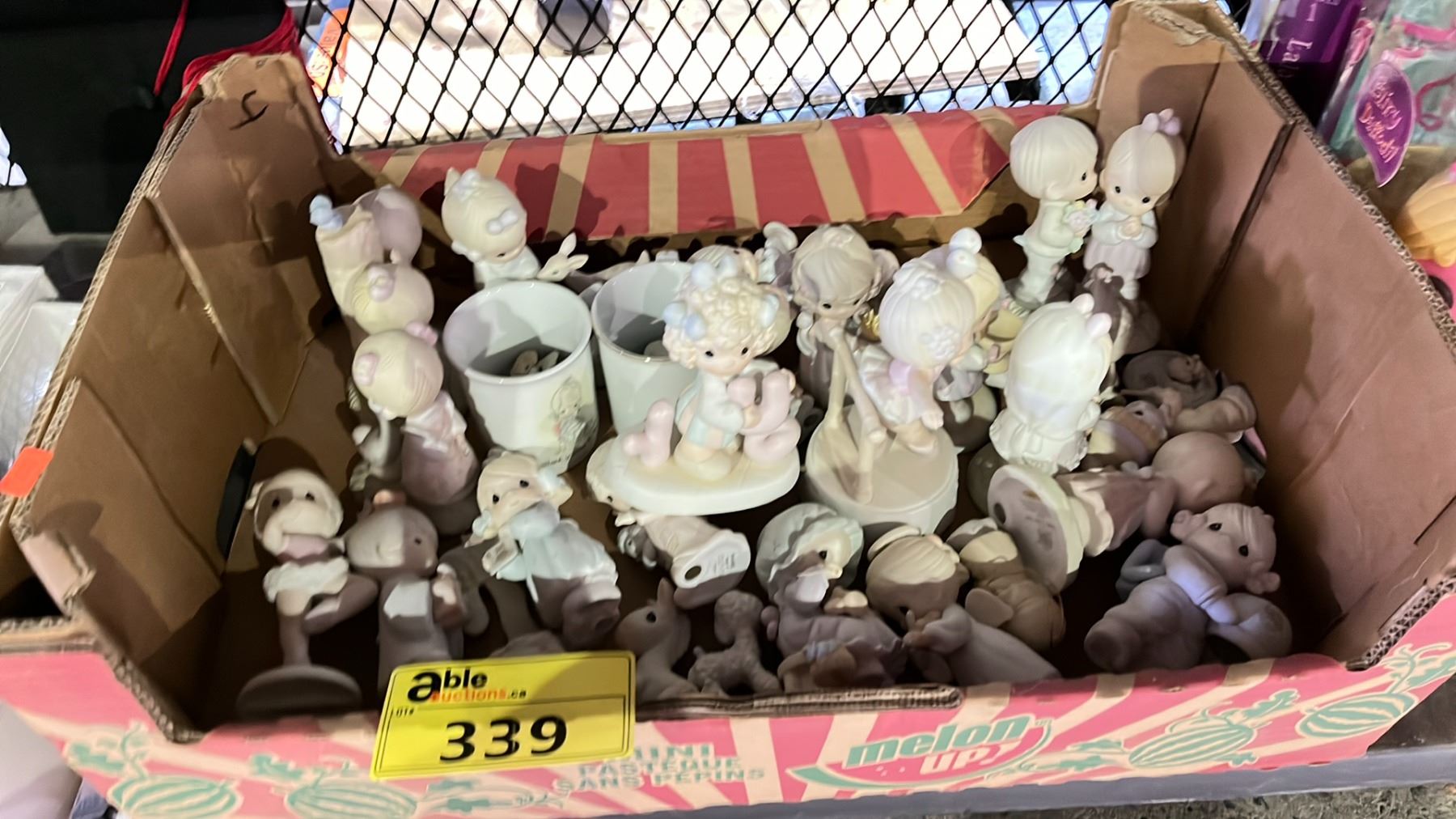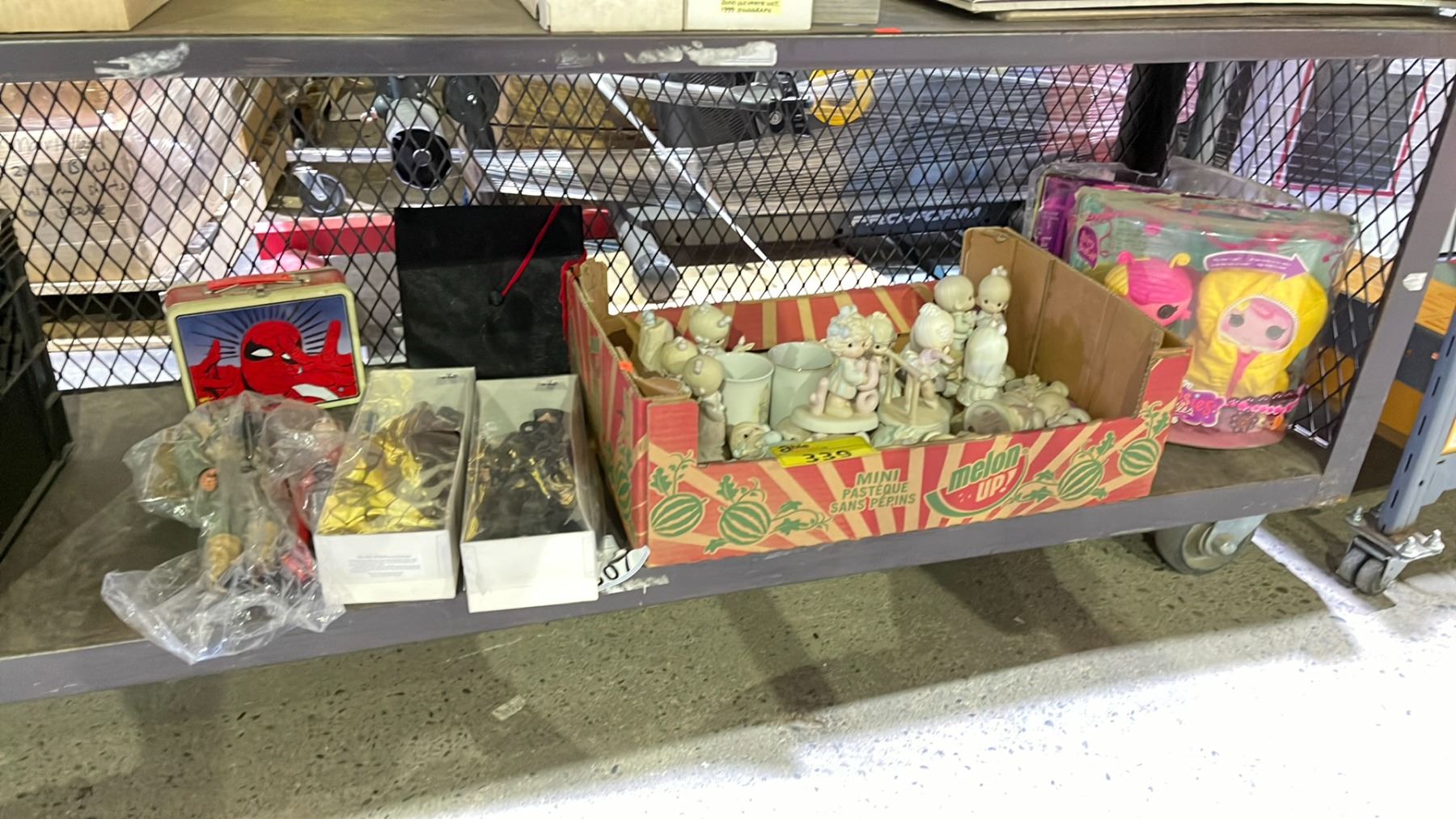 LOT OF ASSORTED ITEMS INCLUDING; HARLEY QUINN FIGURE, SPIDERMAN LUNCHBOX, PRECIOUS MOMENTS COLLECTIBLES & MORE