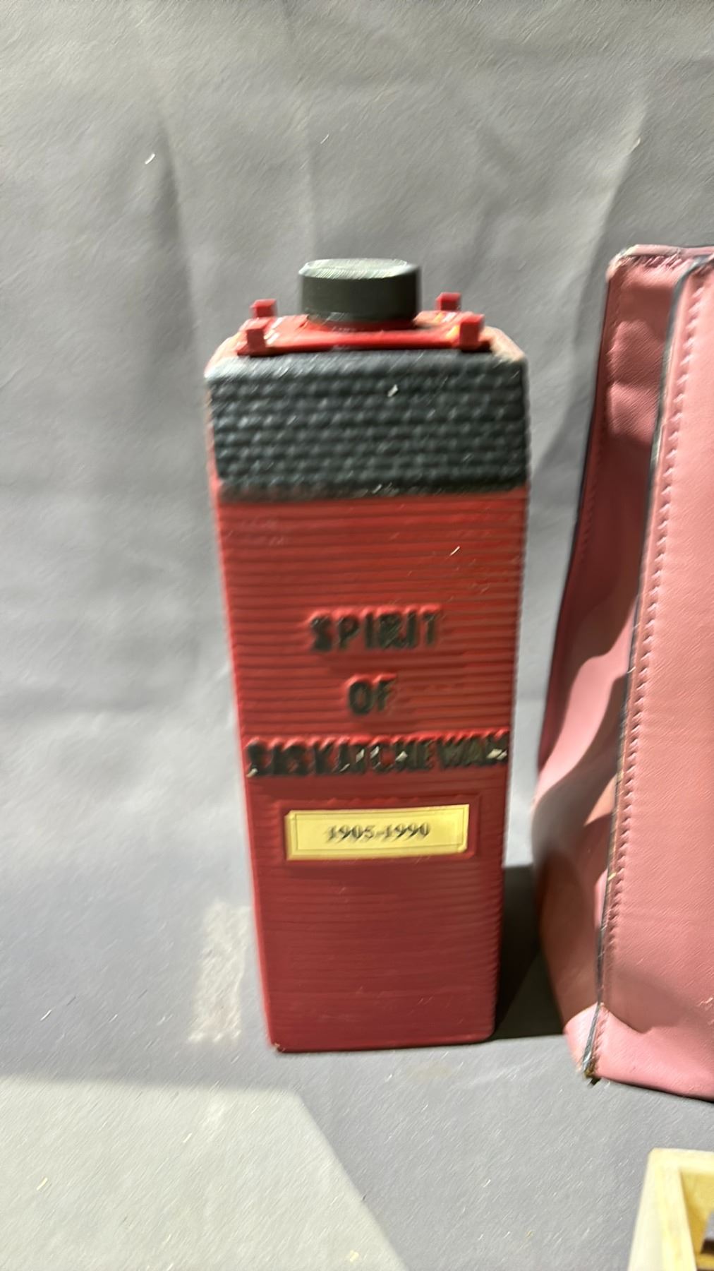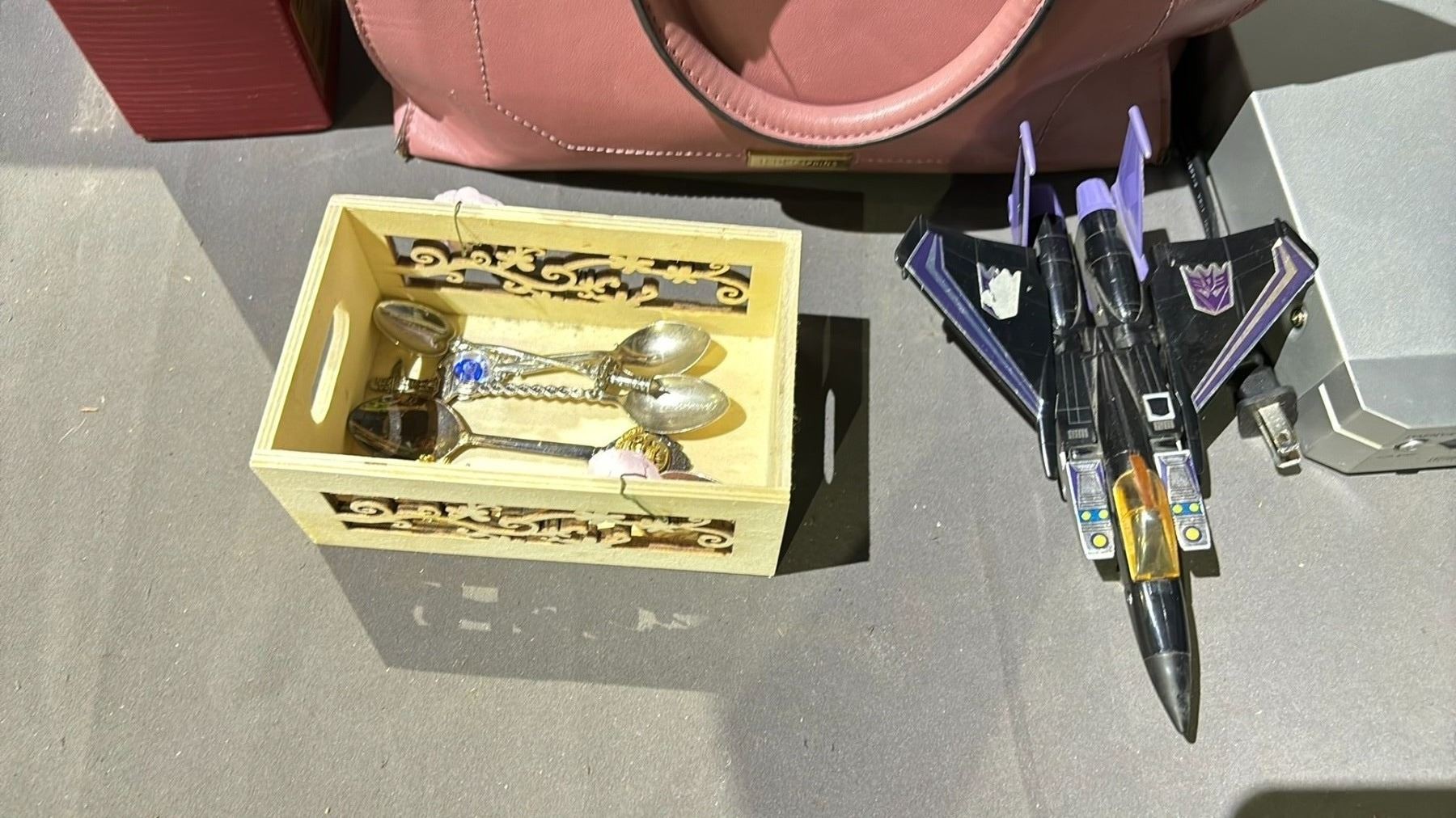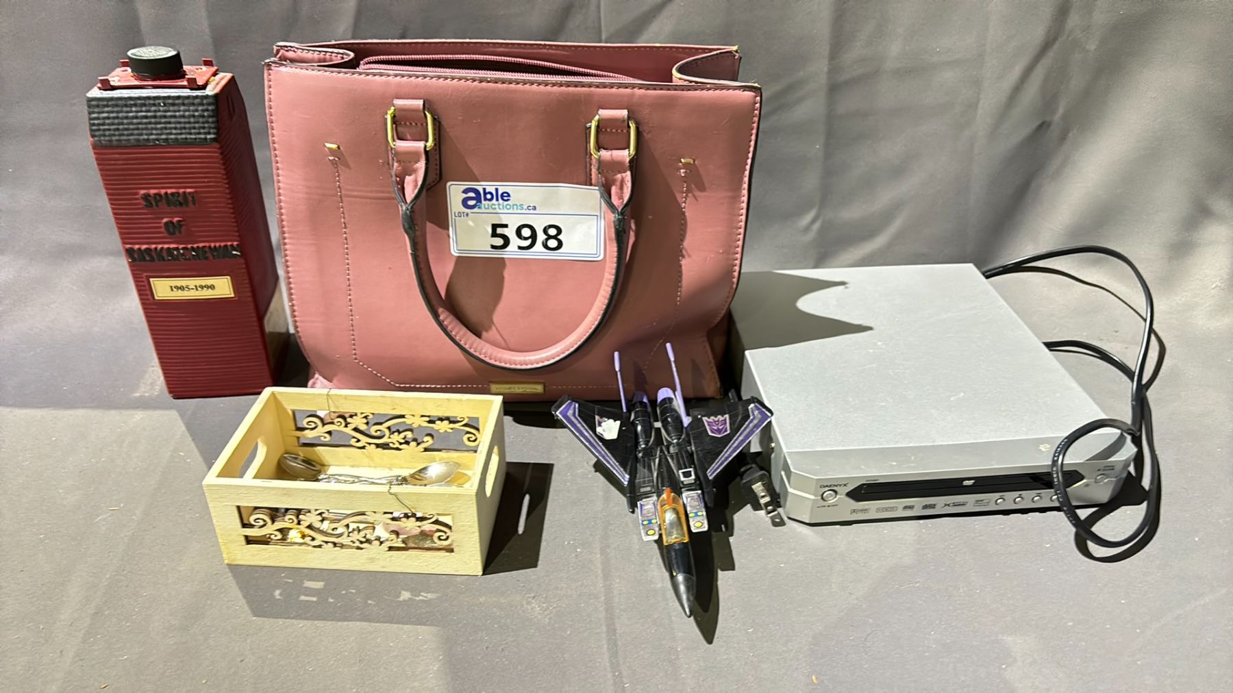 LOT OF ASSORTED ITEMS INCLUDING; SPIRIT OF SASKATCHEWAN WHISKEY BOTTLE, TRANSFORMERS TOY, STERLING SILVER SPOONS & MORE