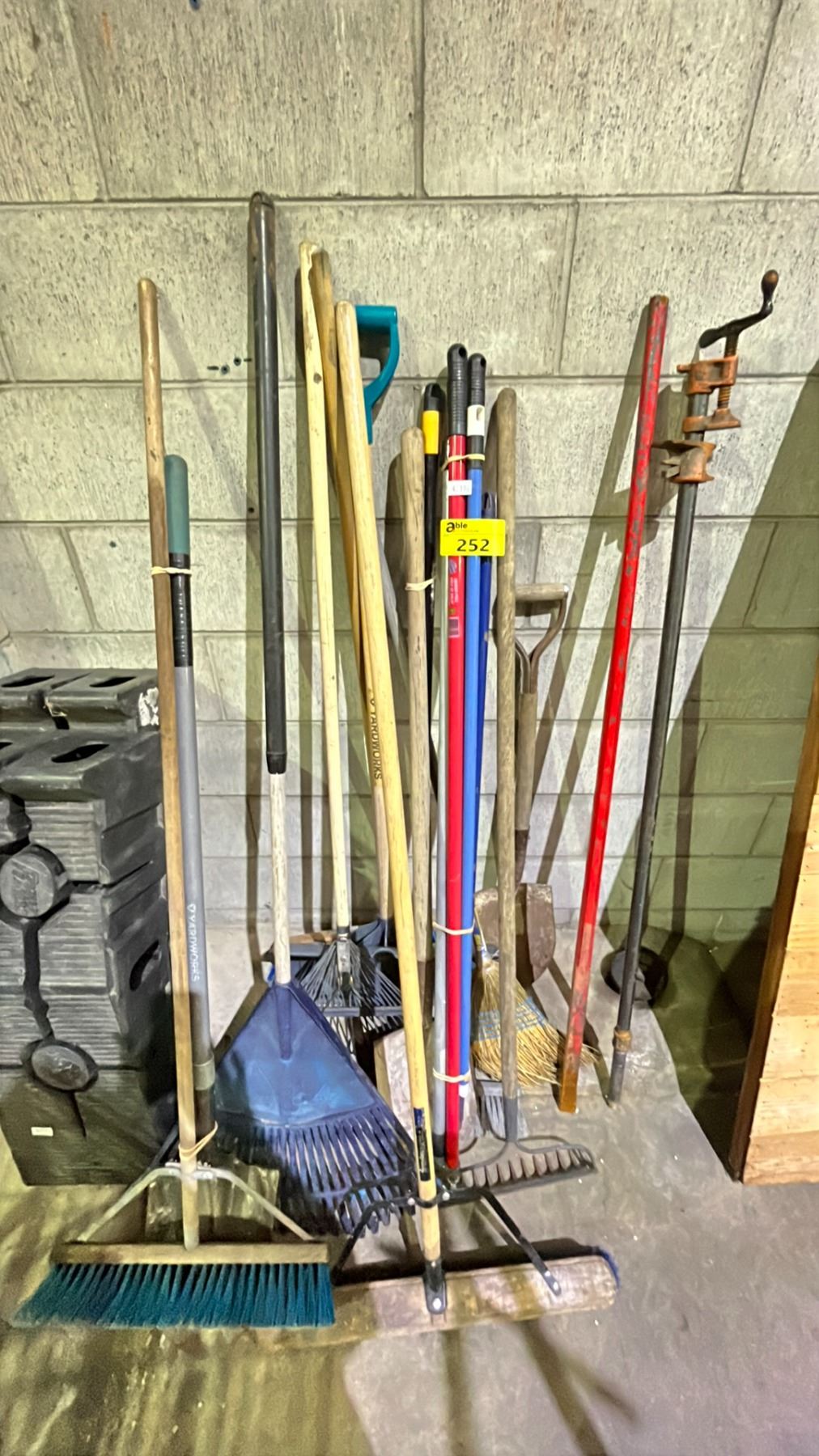LOT OF ASSORTED LAWN, GARDEN & HOME TOOLS INCLUDING; BROOMS, RAKES, SHOVELS & PIPE CLAMP
