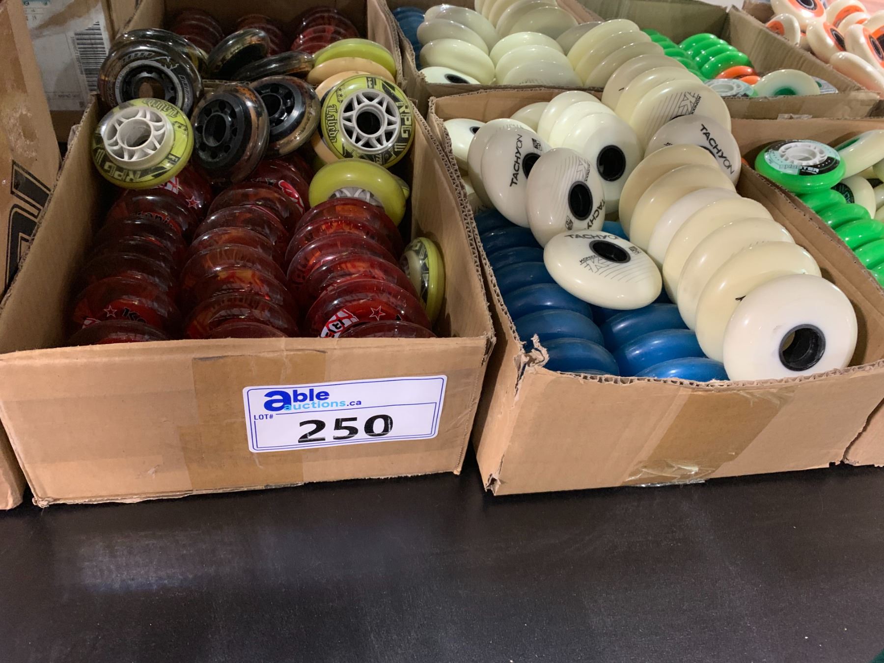 LOT OF ASSORTED ROLLER SKATE WHEELS IN VARIOUS SIZES & COLOURS