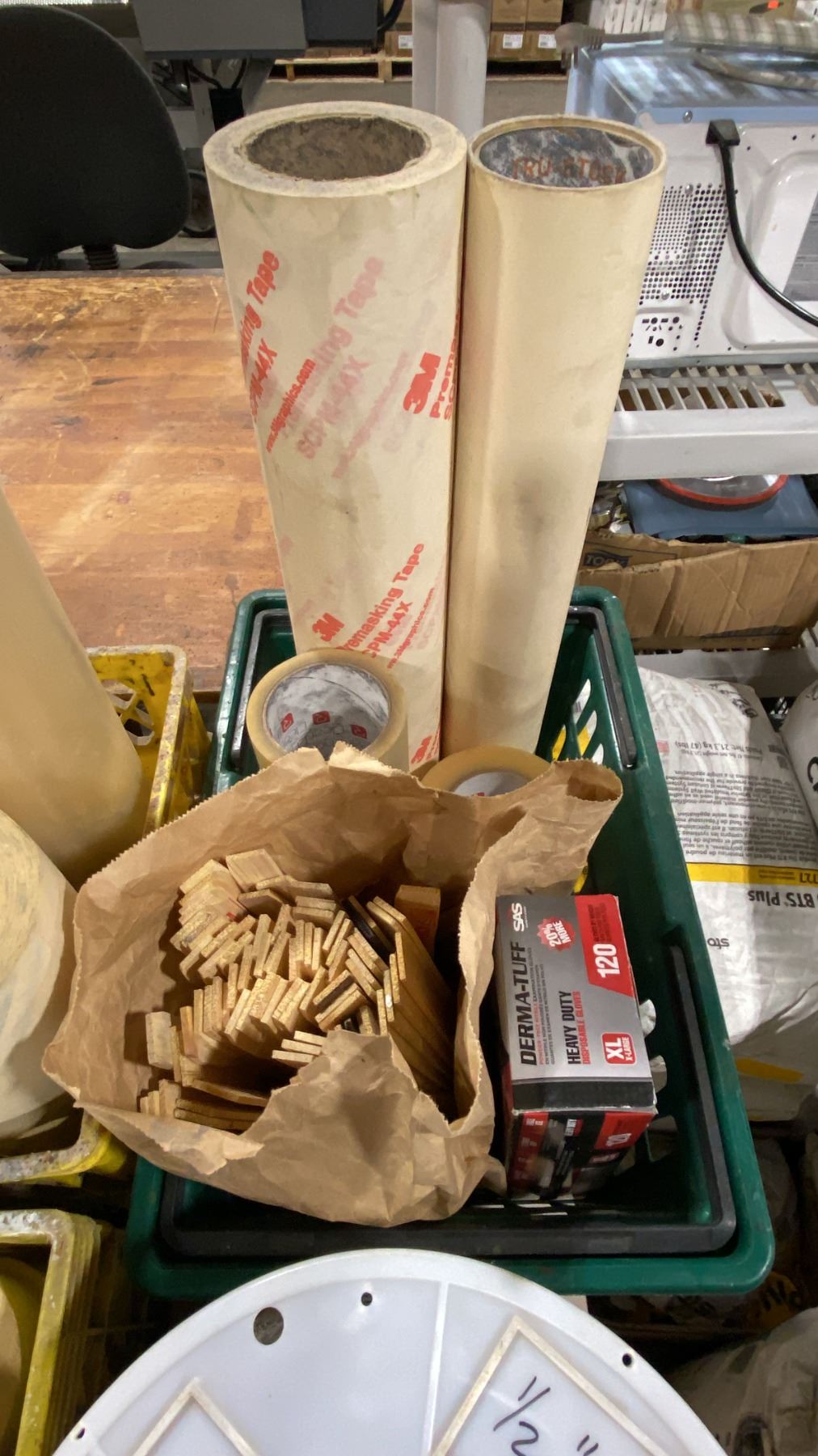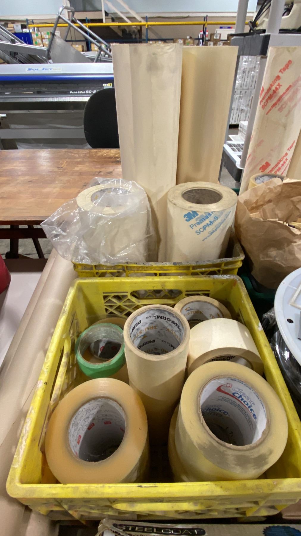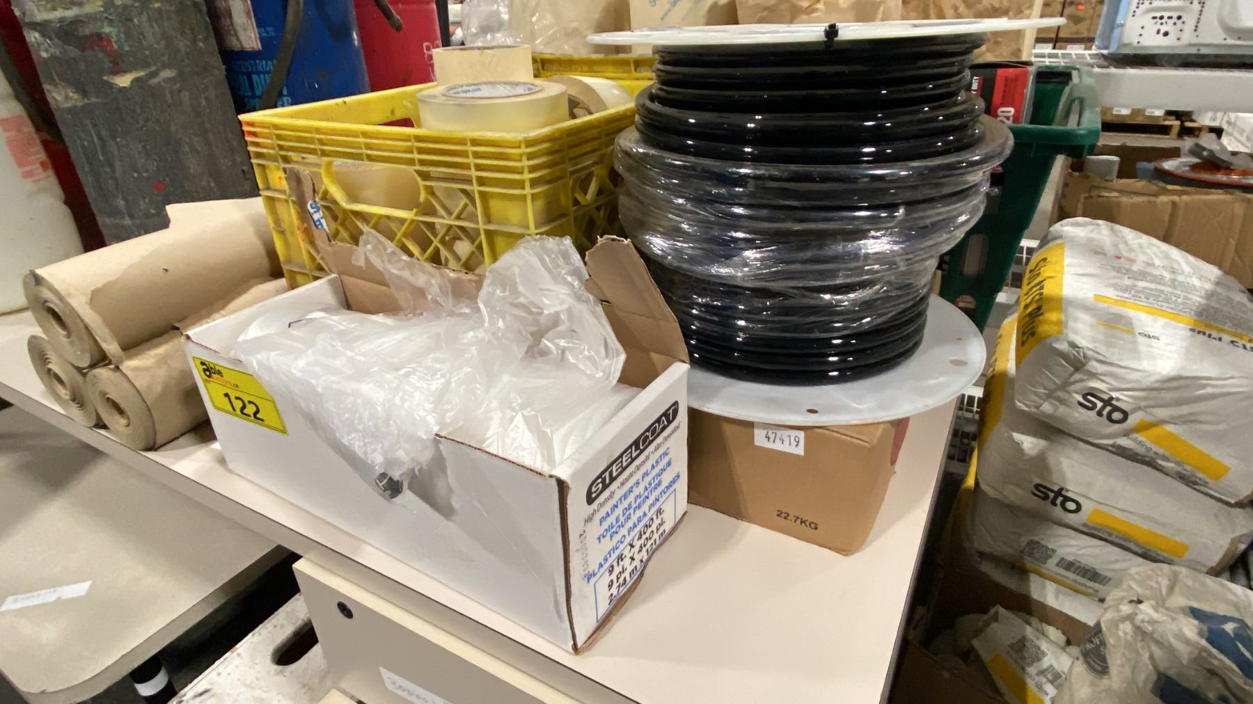 LOT OF ASSORTED ROLLS OF PACKAGING PAPER, PRE MASKING PAPER, TAPE, HOSE & PAINTERS PLASTIC * CRATES INCLUDED *