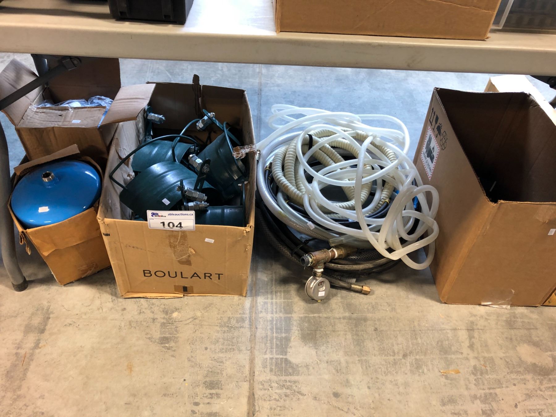 LOT OF ASSORTED TUBING, 2 PROFLO WATER HEATER SAFETY TANKS, WALL MOUNTED HOSE HANGERS, 4" ADJUSTABLE PIPE CLAMPS, AND TUBING