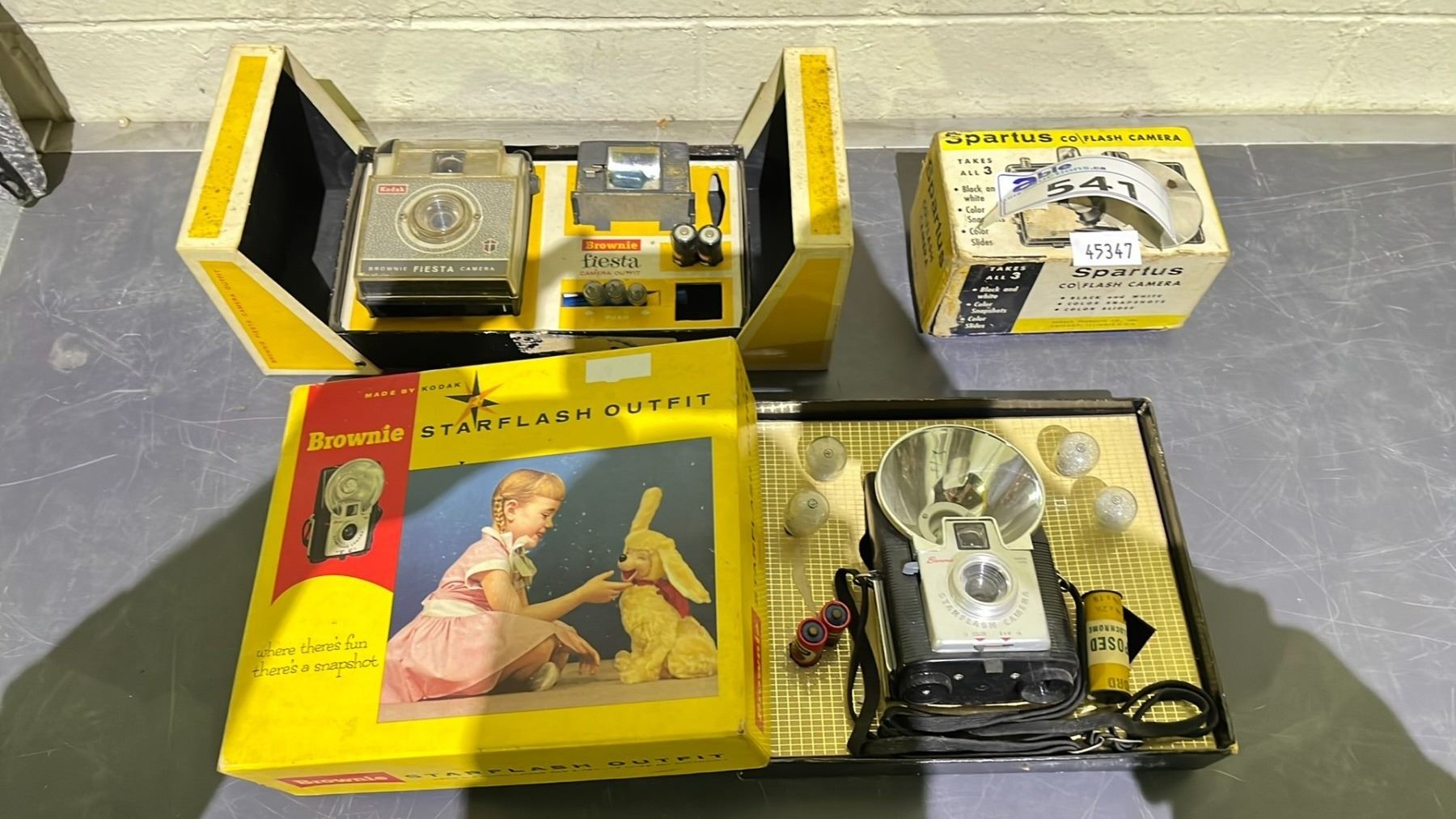 LOT OF ASSORTED VINTAGE CAMERA EQUIPMENT INCLUDING; BROWNIE STARFLASH OUTFIT, SPARTUS CO/FLASH CAMERA & BROWNIE FIESTA CAMERA OUTFIT