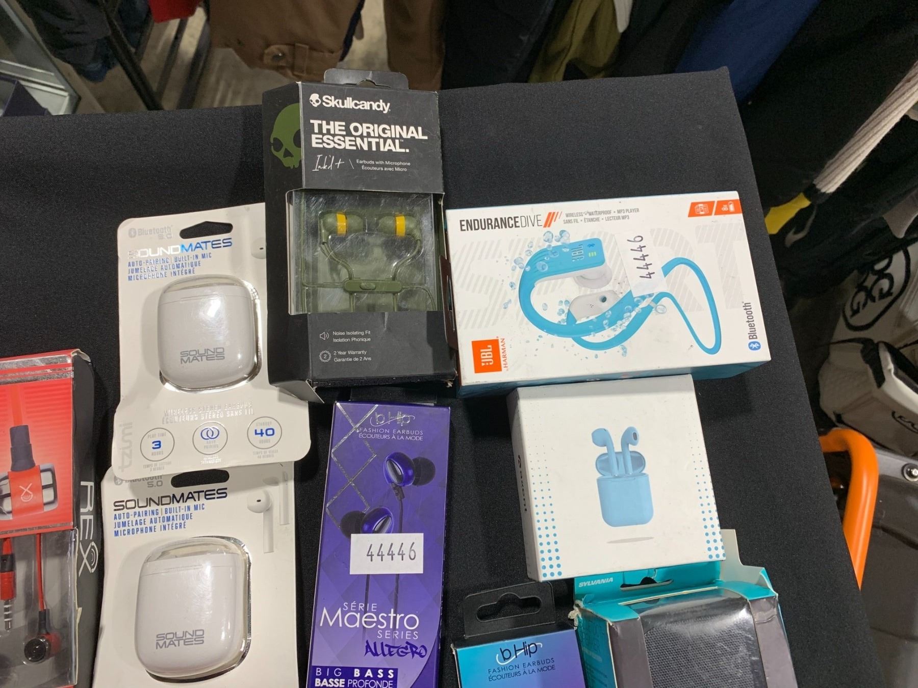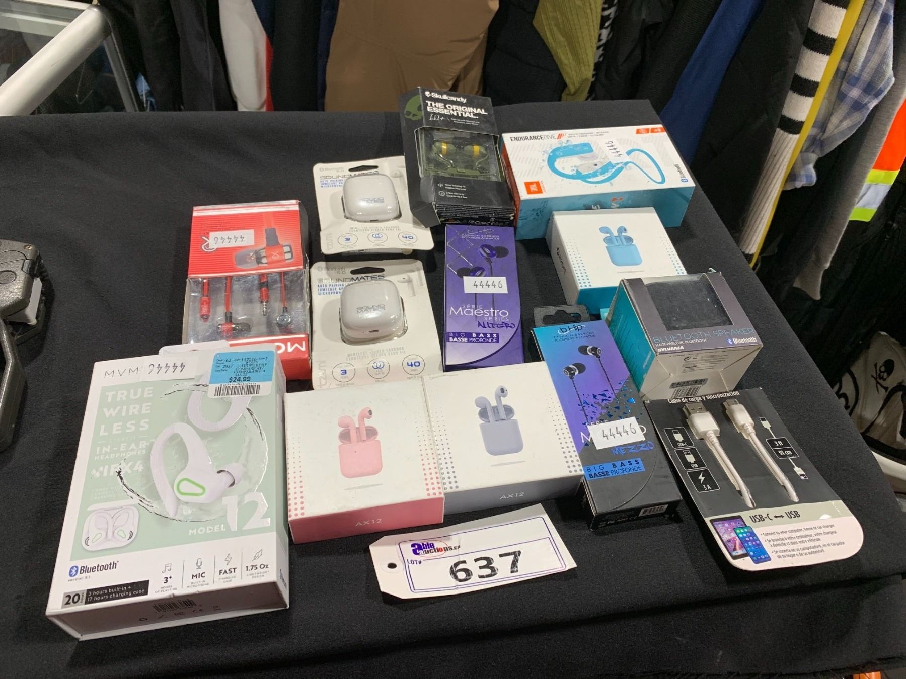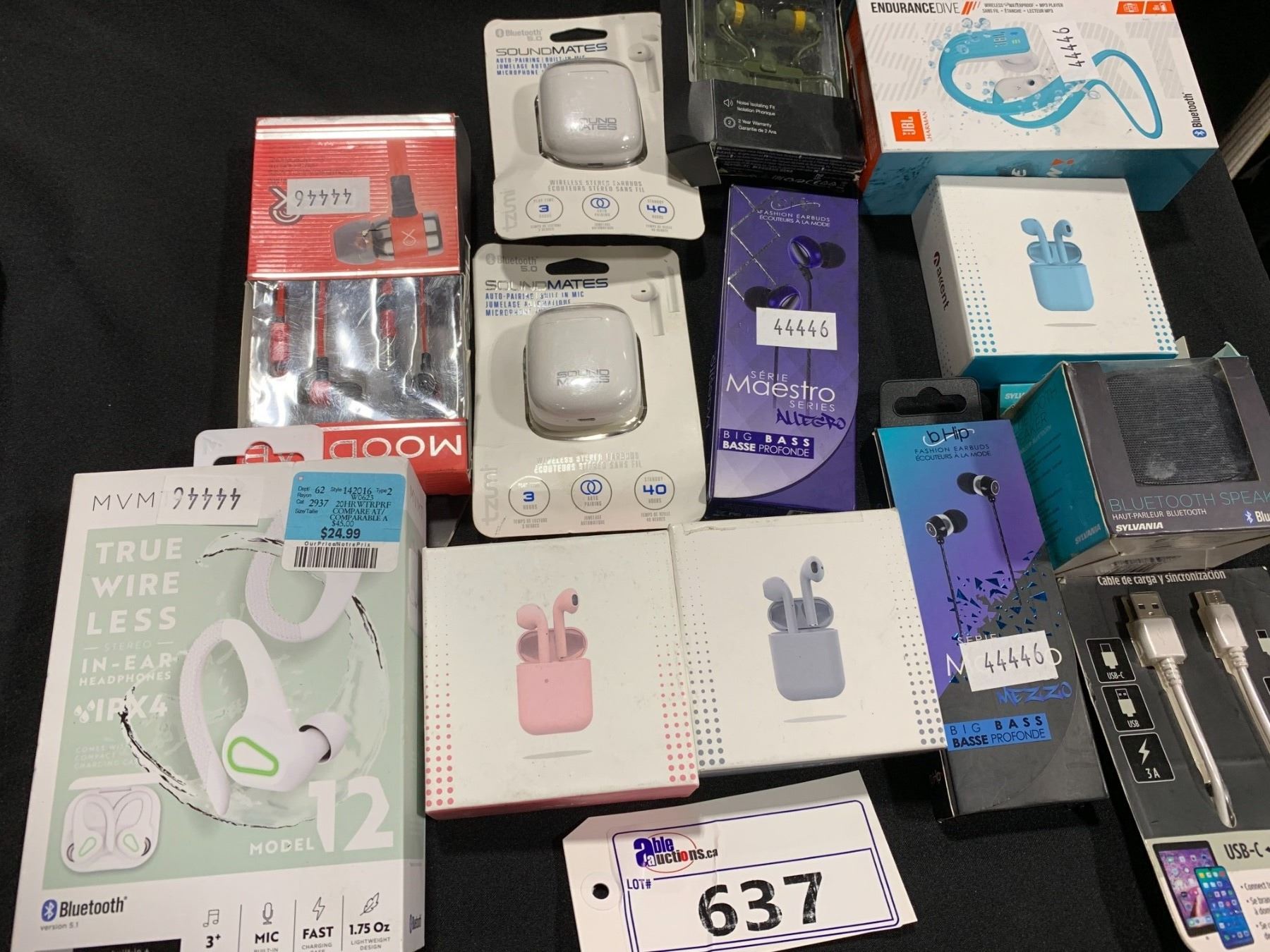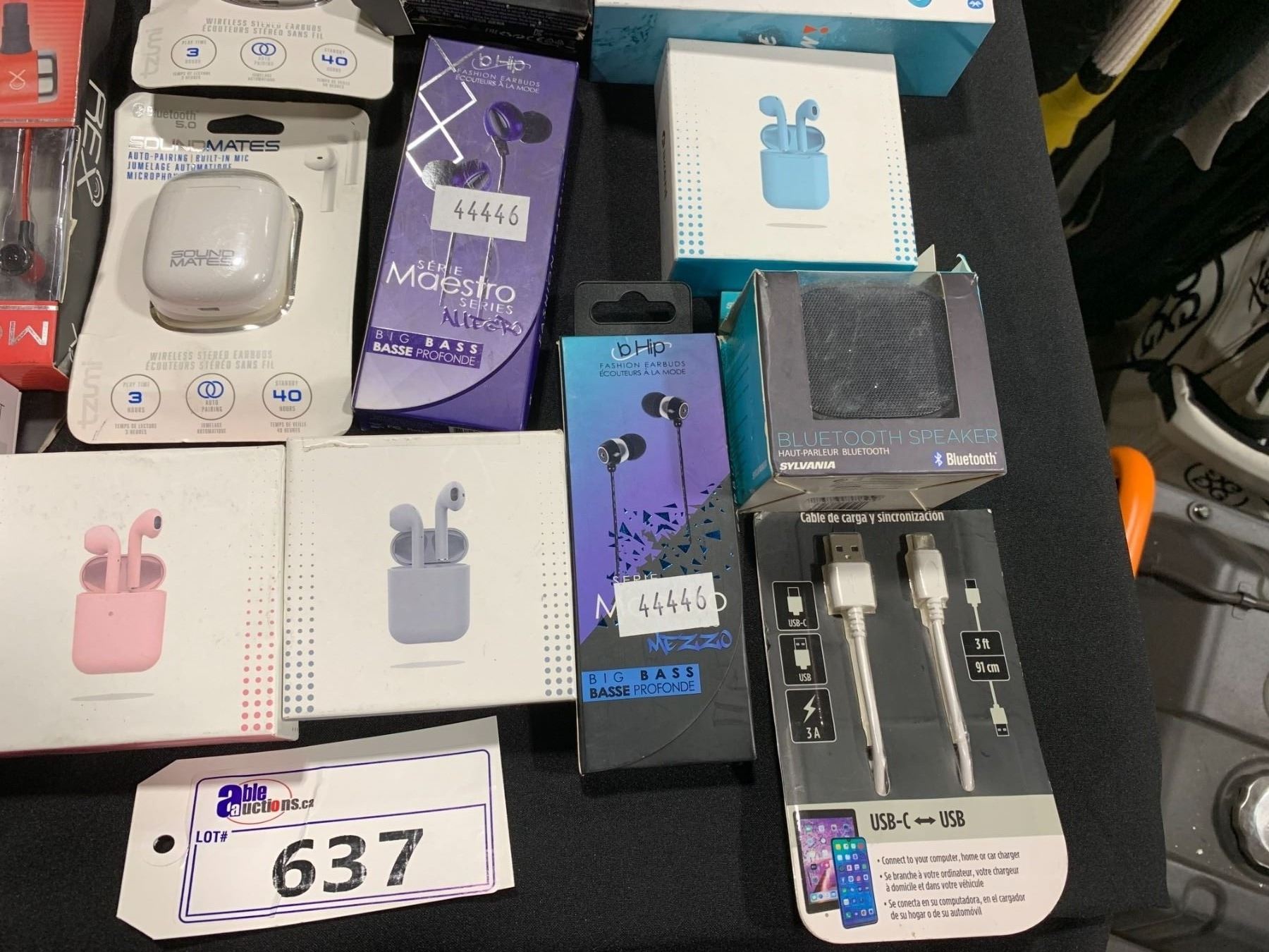 LOT OF ASSORTED WIRELESS AIRBUDS, SPEAKER, HEADPHONES & CHARGING CABLE