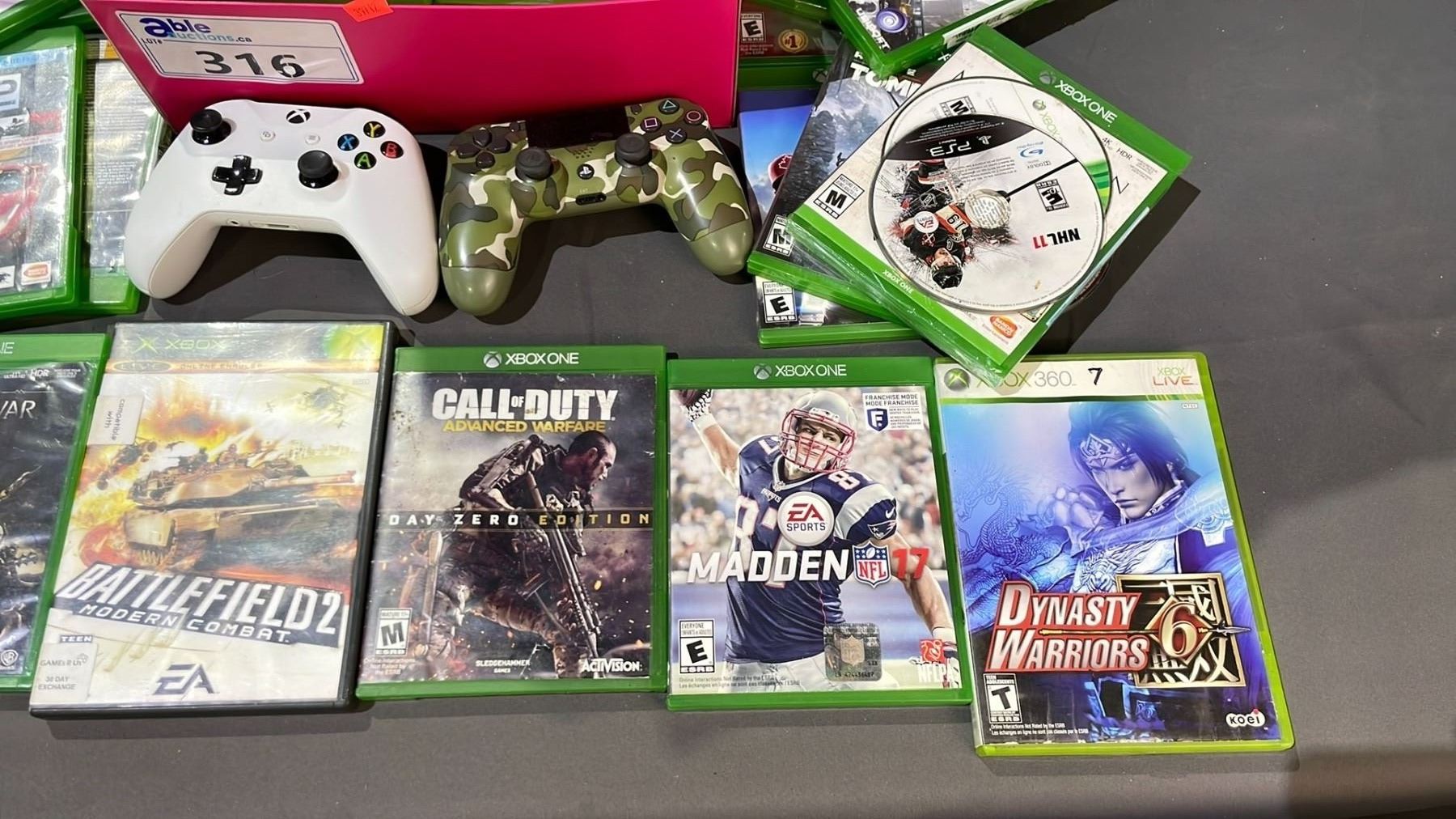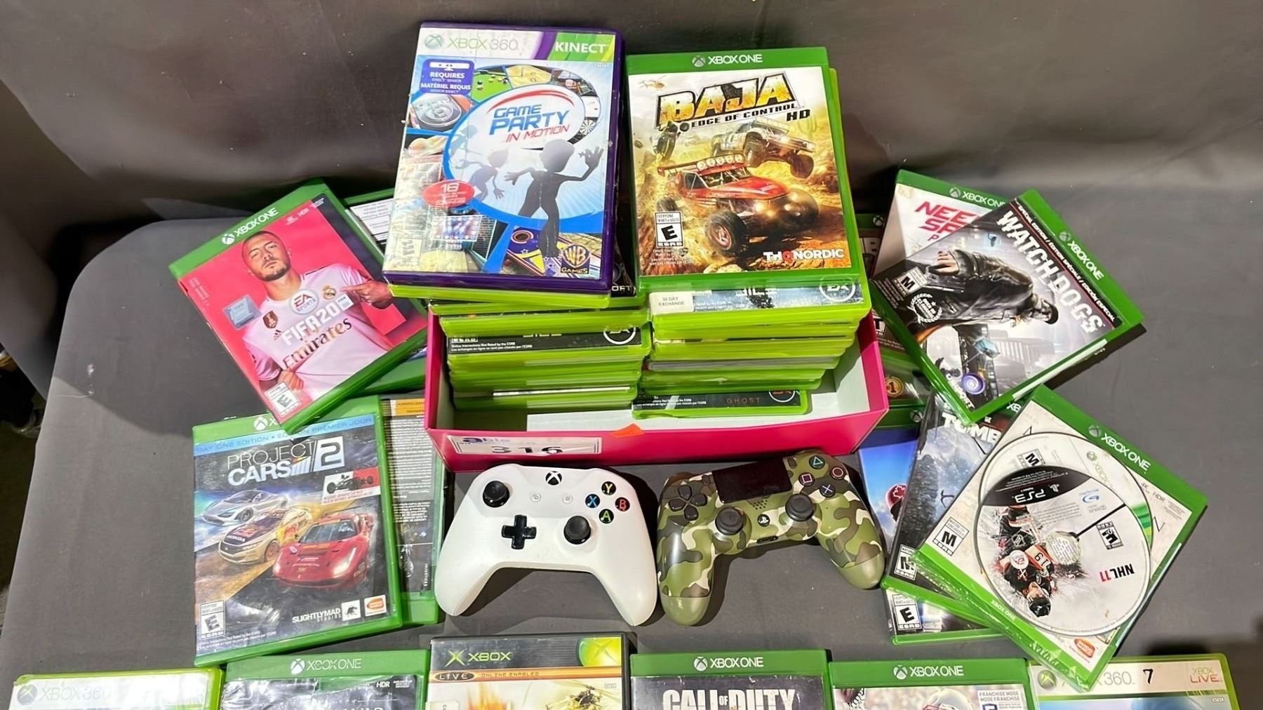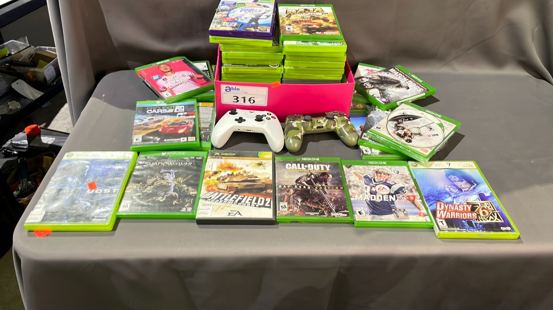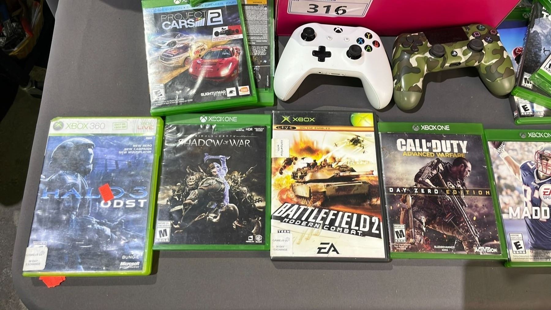 LOT OF ASSORTED XBOX GAMES, XBOX CONTROLLER & PLAYSTATION CONTROLLER (GAMES MAY BE EMPTY CASES)