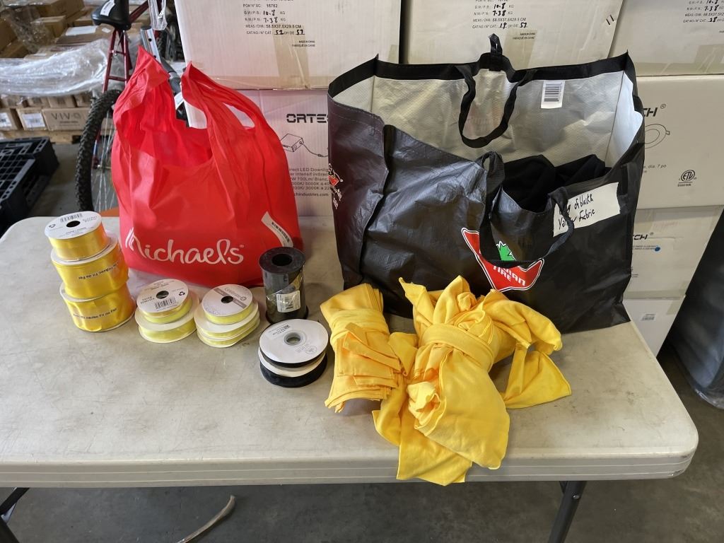 LOT OF BLACK AND YELLOW WRAPPING PAPER ROLLS, FABRIC, AND BAG OF RIBBON