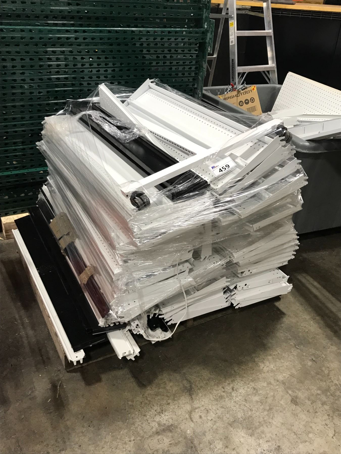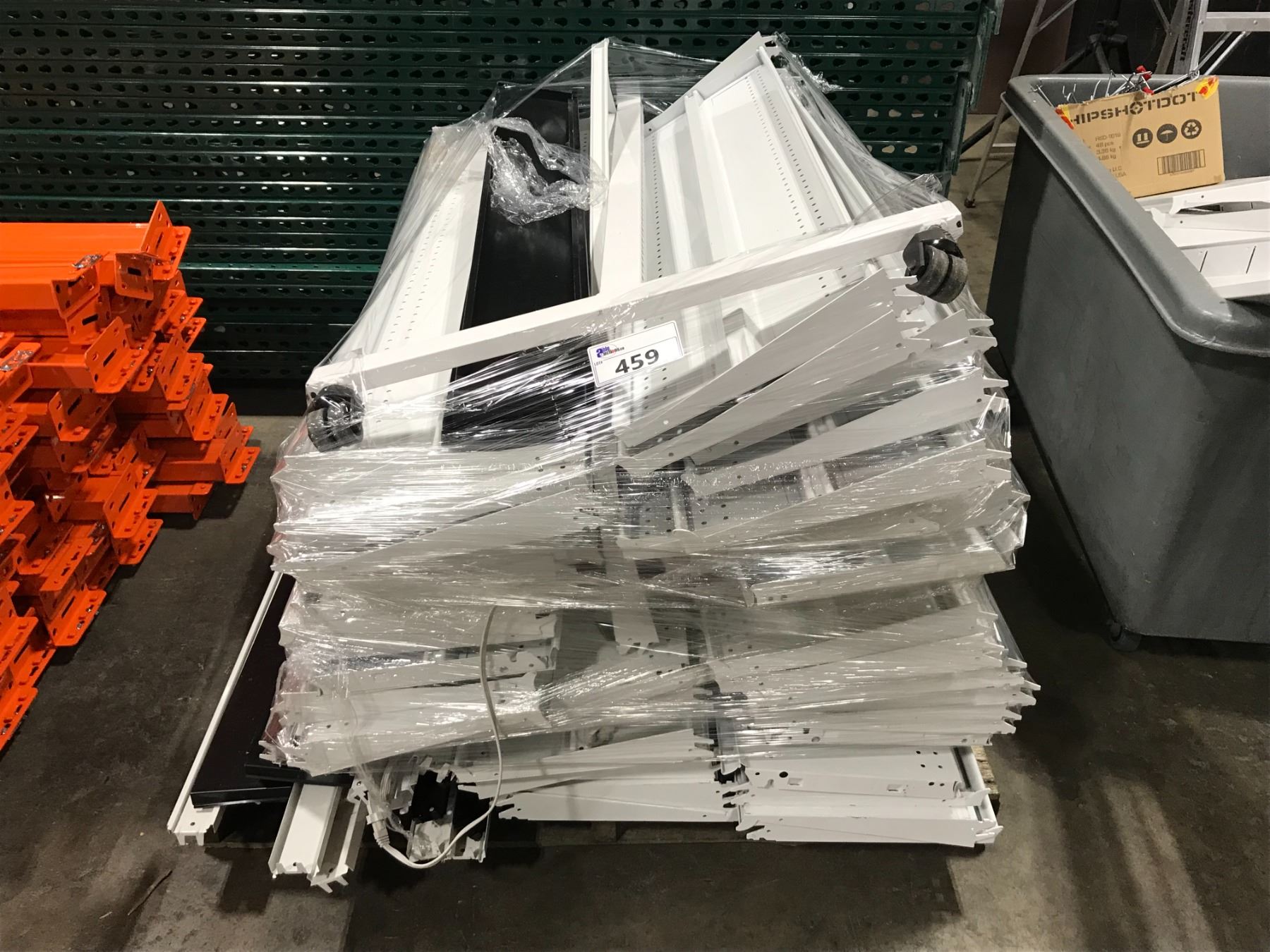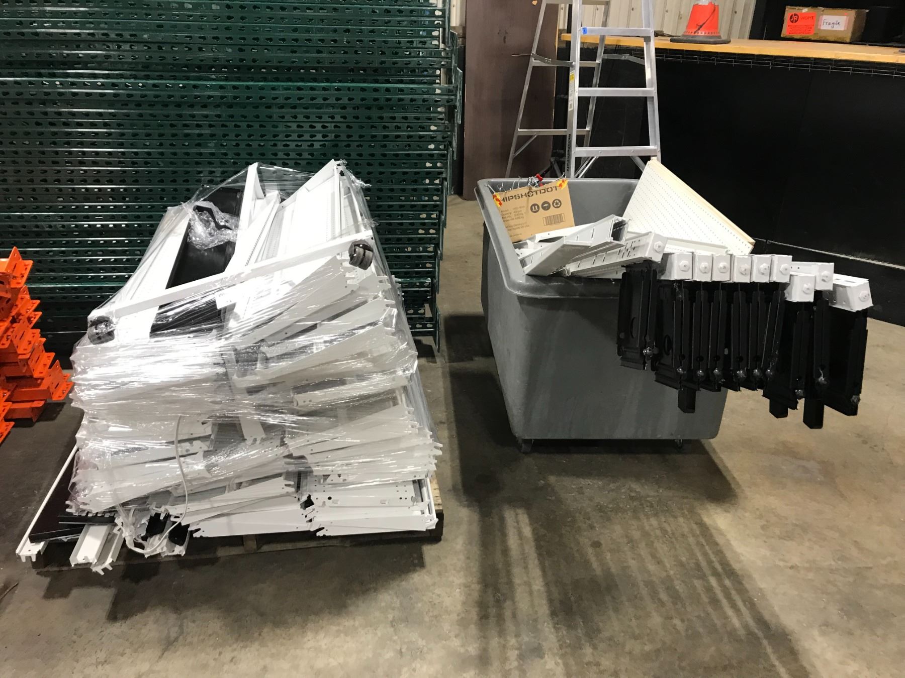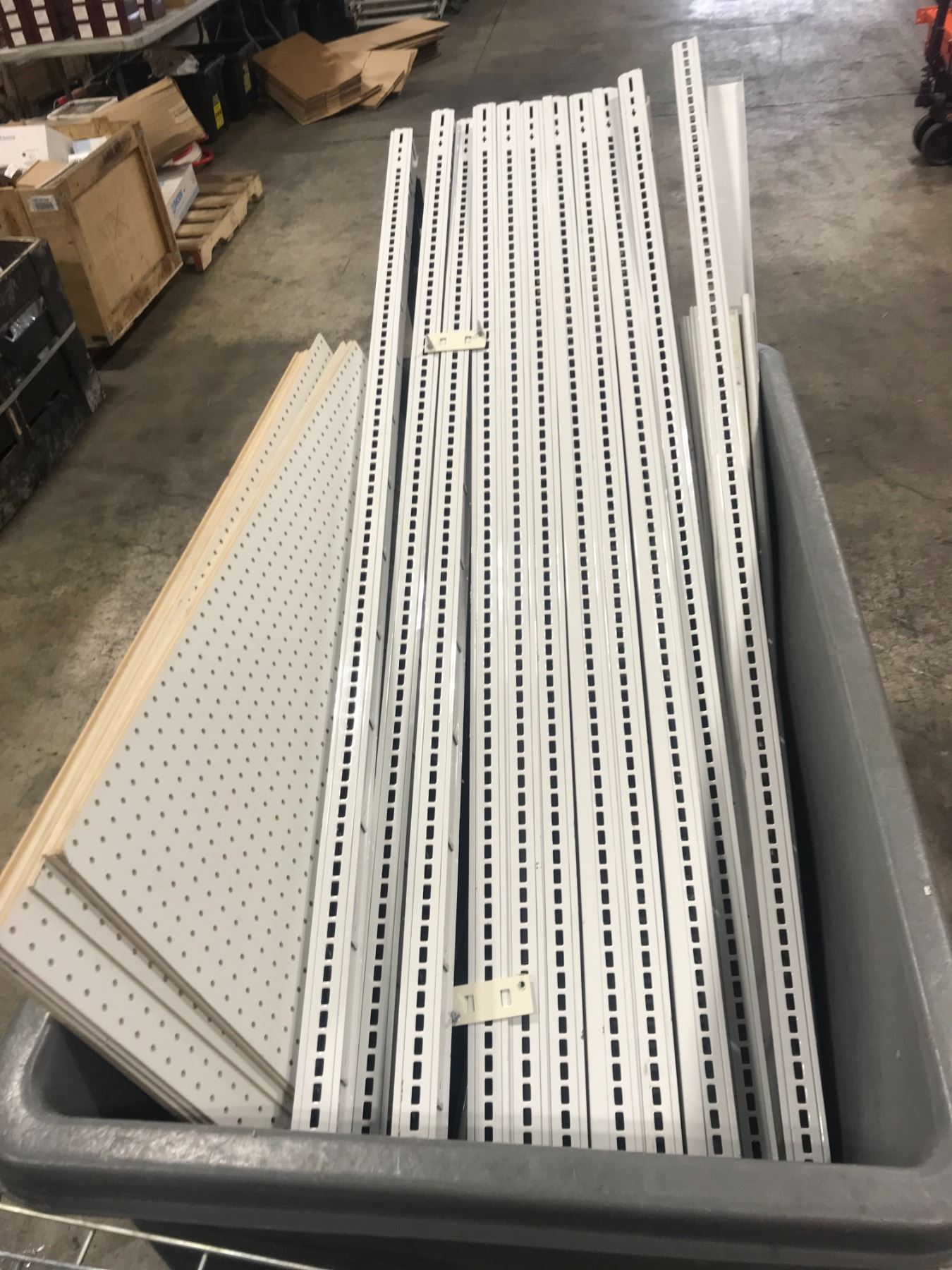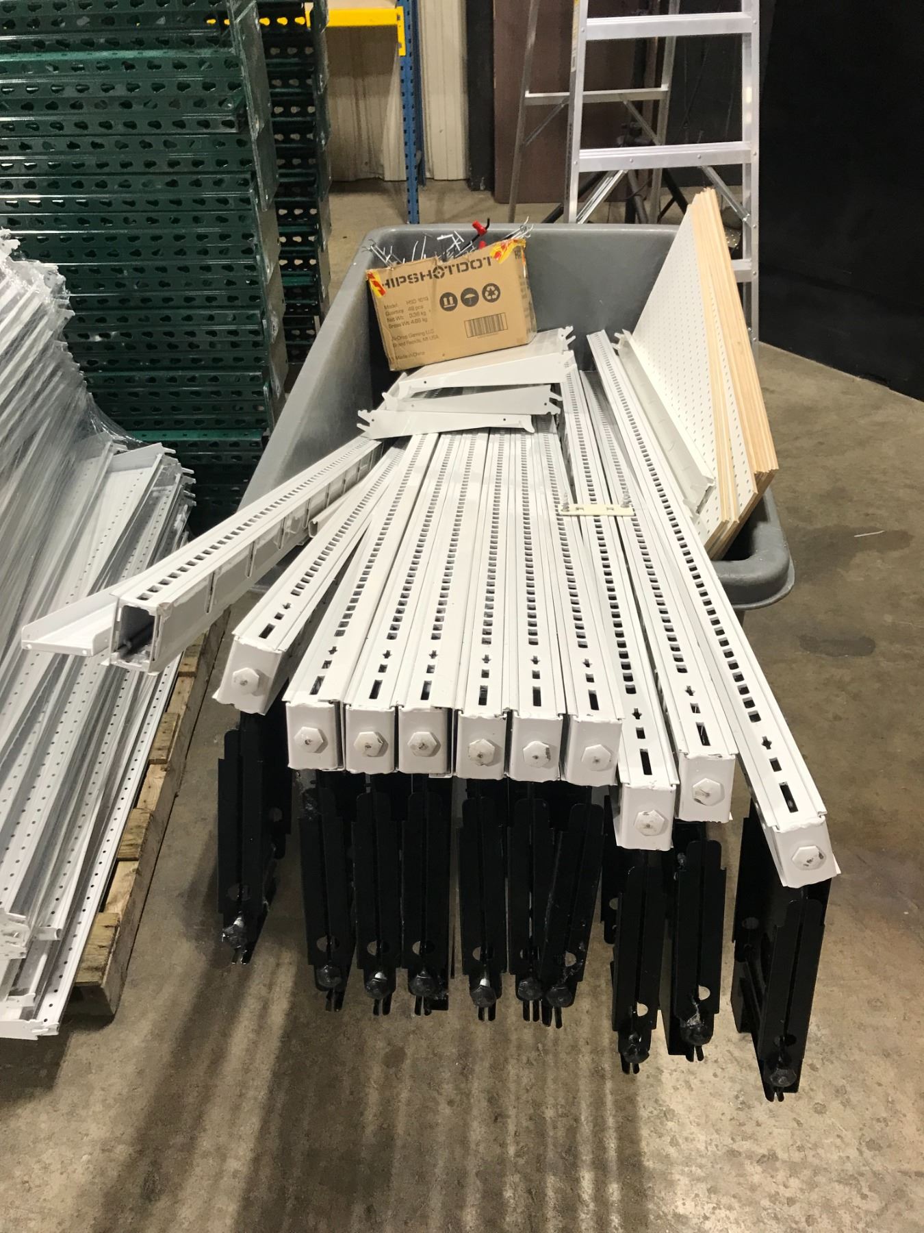LOT OF BLACK/WHITE METAL GONDOLA SHELVING SYSTEM WITH UPRIGHTS, SHELVES, PEG BACKBOARD AND HARDWARE *ROLLING BIN NOT INCLUDED*