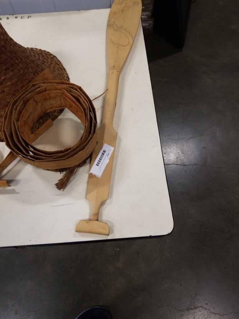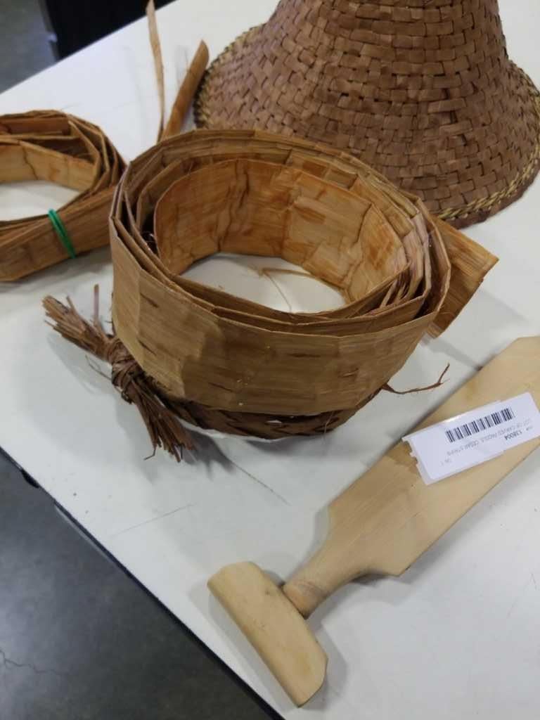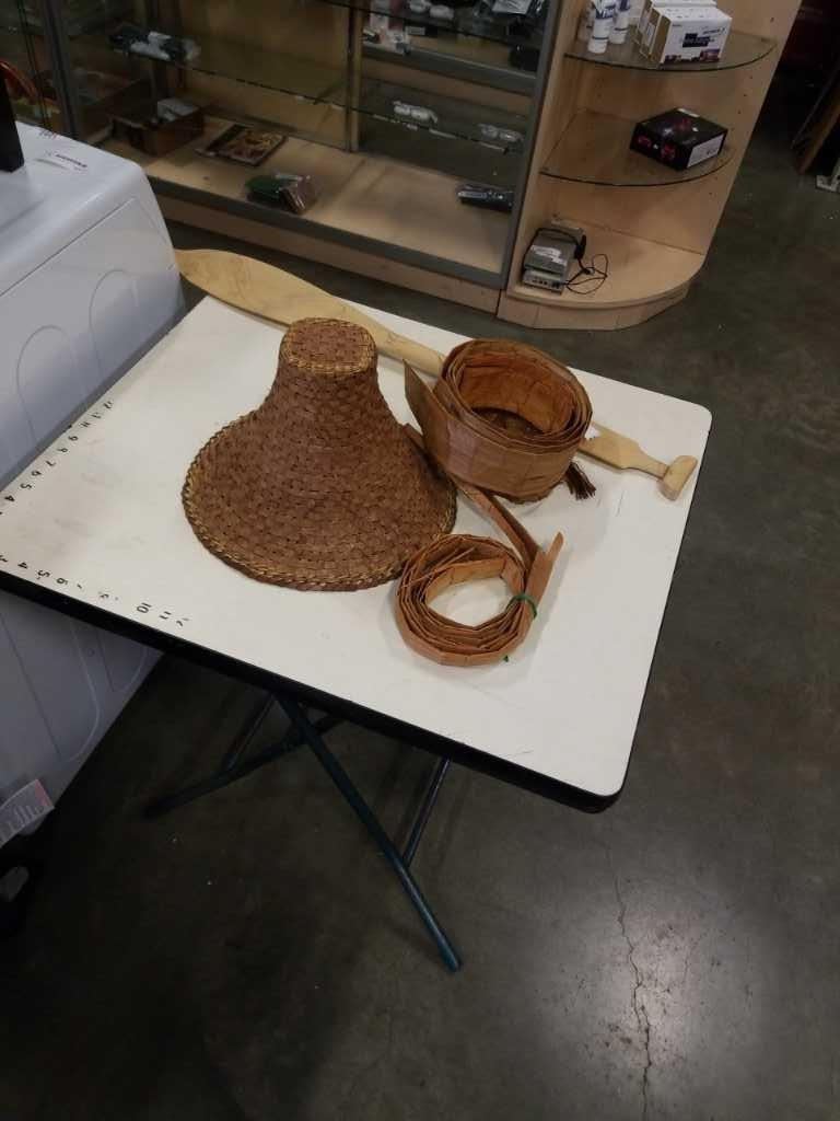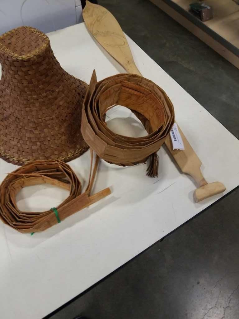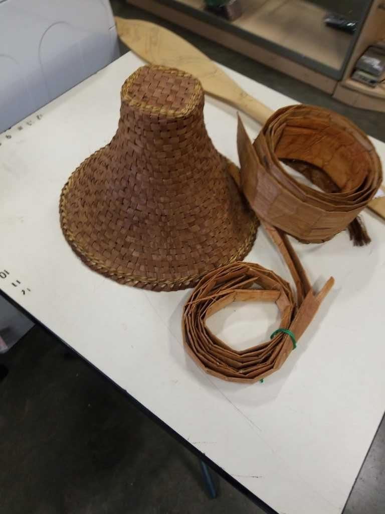 LOT OF CARVED PADDLE, CEDAR STRIPS AND WOVEN HAT