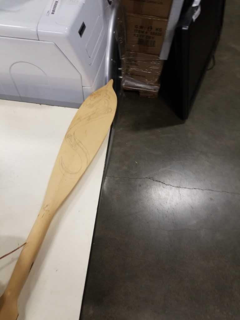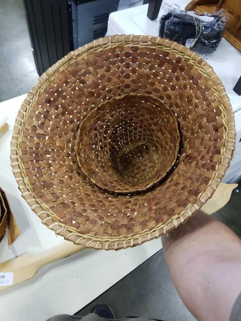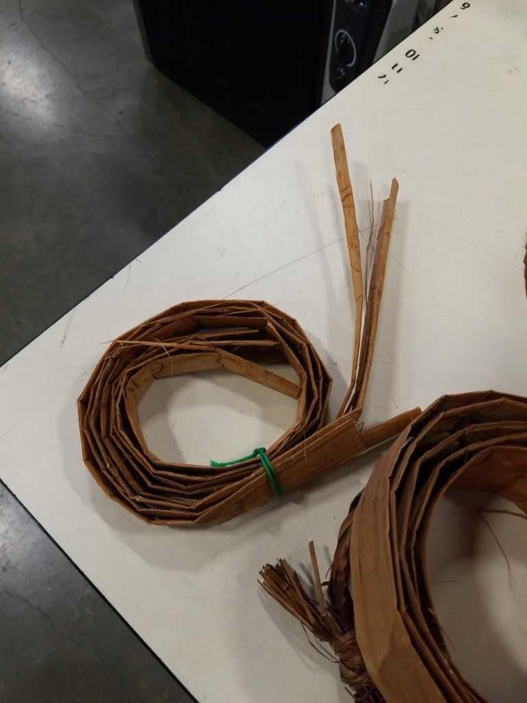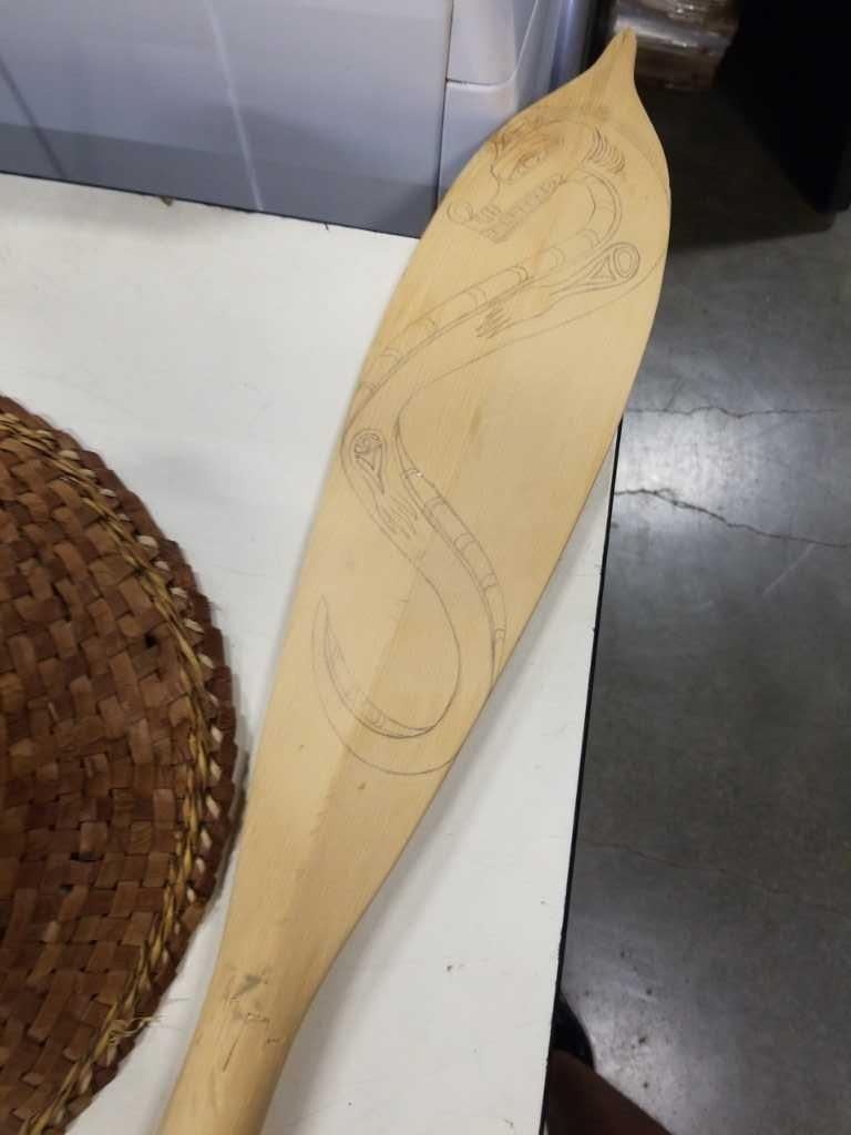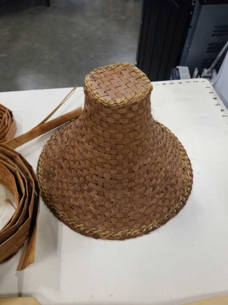 LOT OF CARVED PADDLE, CEDAR STRIPS AND WOVEN HAT