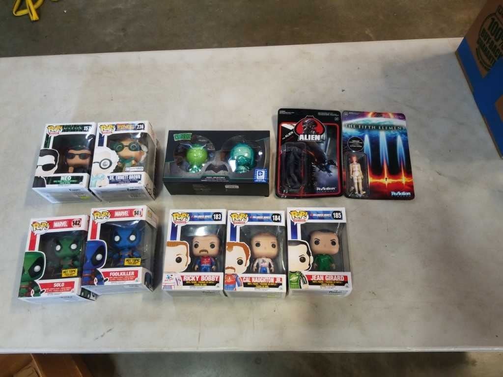 LOT OF COLLECTABLE FIGURES IN BOXES POP FIGURES MARVEL, MATRIX, BACK TO THE FUTURE, TALLADEGA NIGHTS, DORBZ VINYL DARK KNIGHT AND REACTION ALIEN AND FIFTH ELEMENT LEELOO