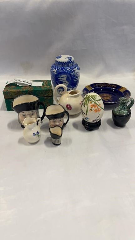 LOT OF COLLECTABLE MINIATURES, 3 MNIATURE TOBY MUGS, LOMOGES DISH
