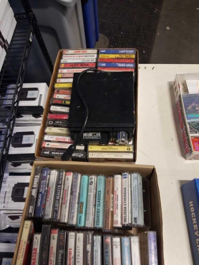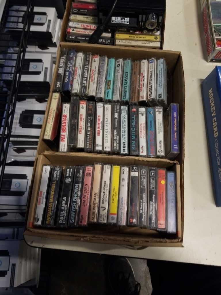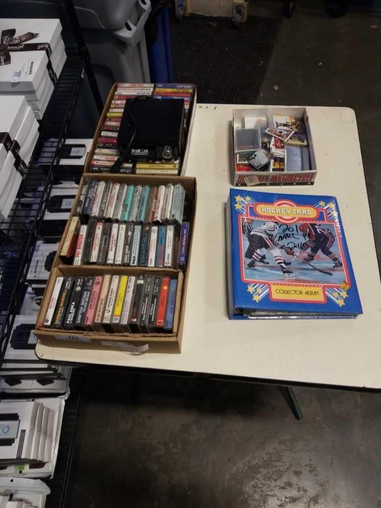 LOT OF COLLECTIBLE SPORTS CARDS, INCLUDING GRETZKY, 2 TRAYS OF CASSETES AND VINTAGE PLAYER
