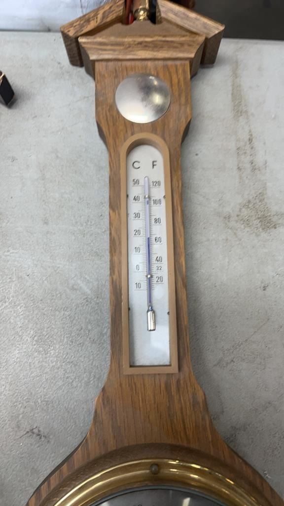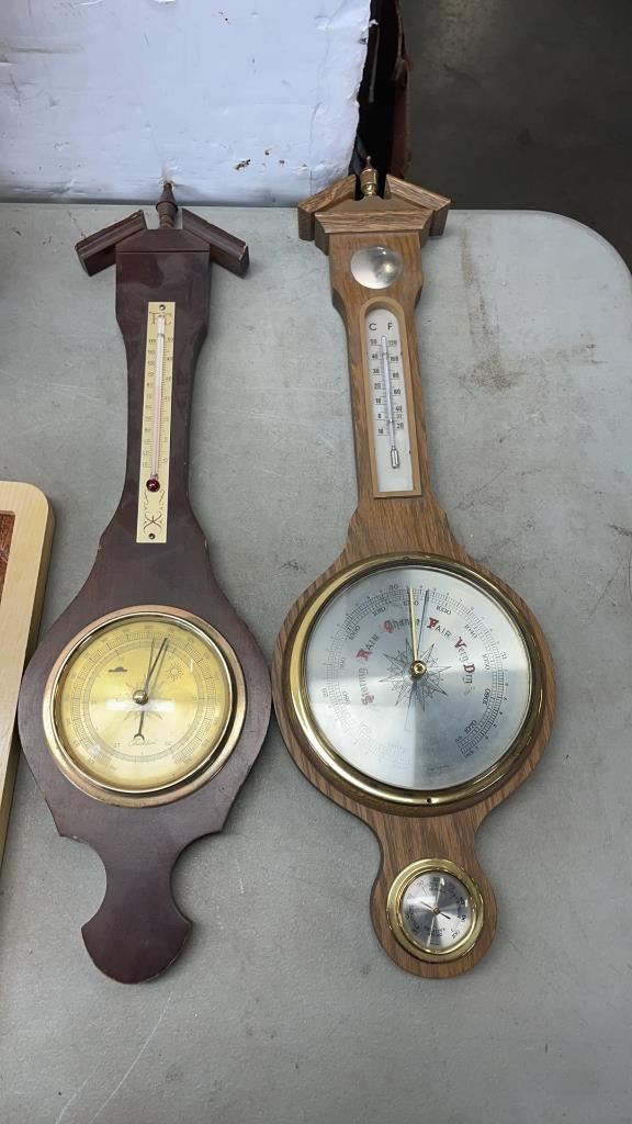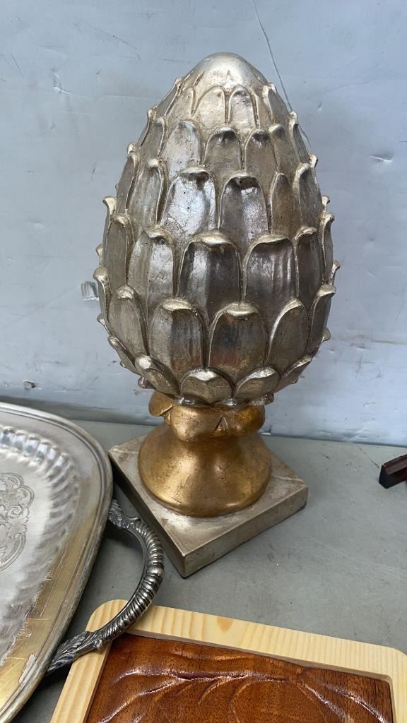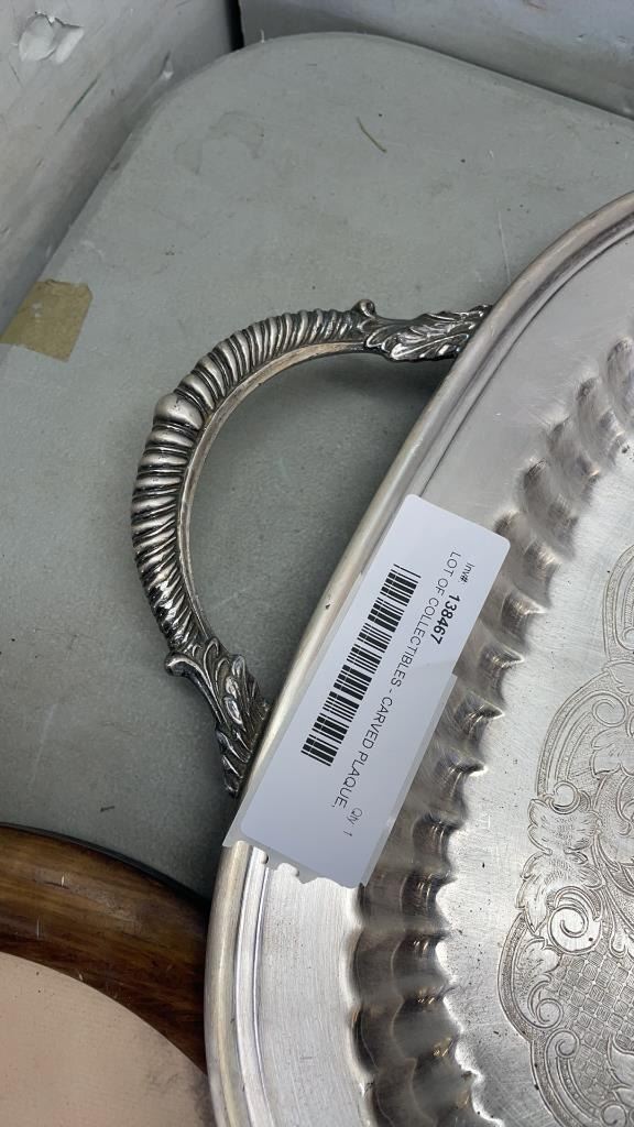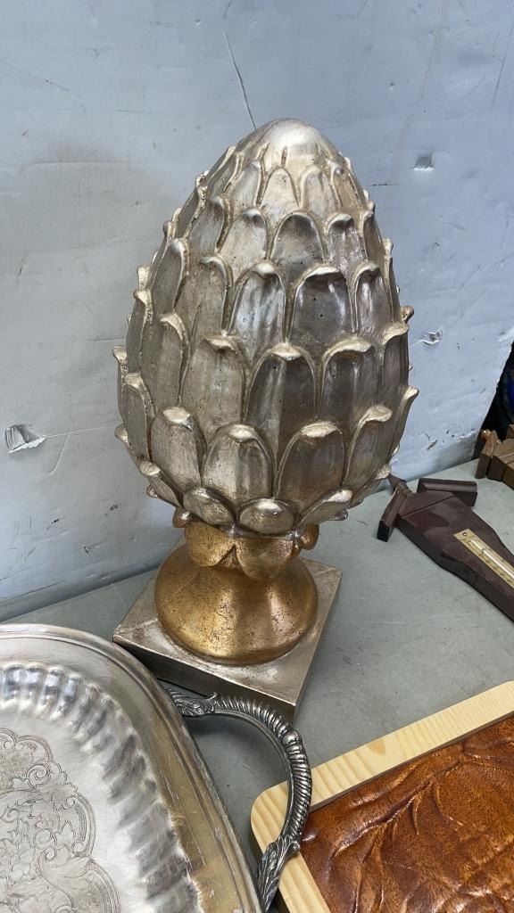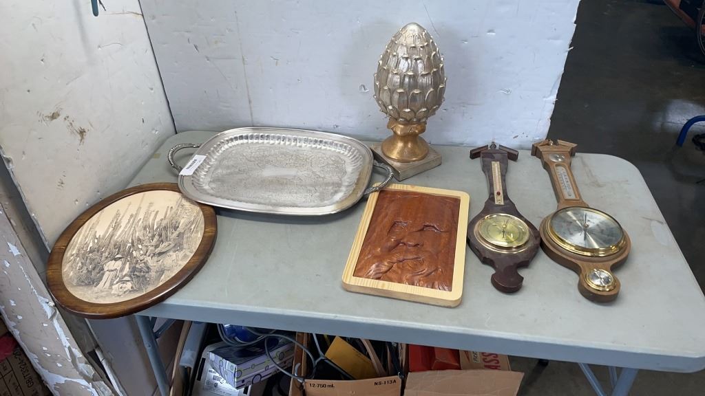 LOT OF COLLECTIBLES - CARVED PLAQUE, EGG STATUE, BAROMETERS, SERVING TRAY AND MORE