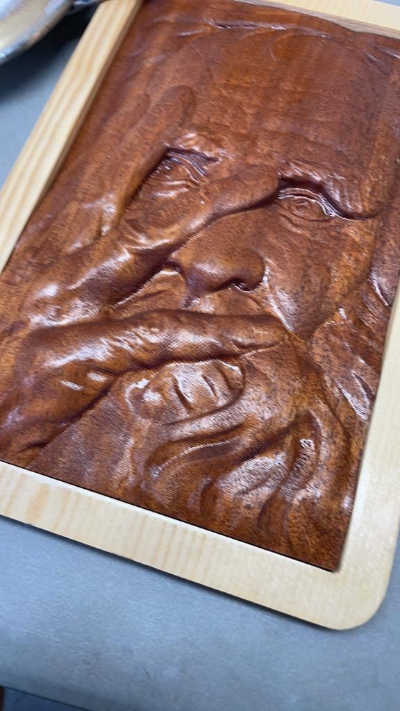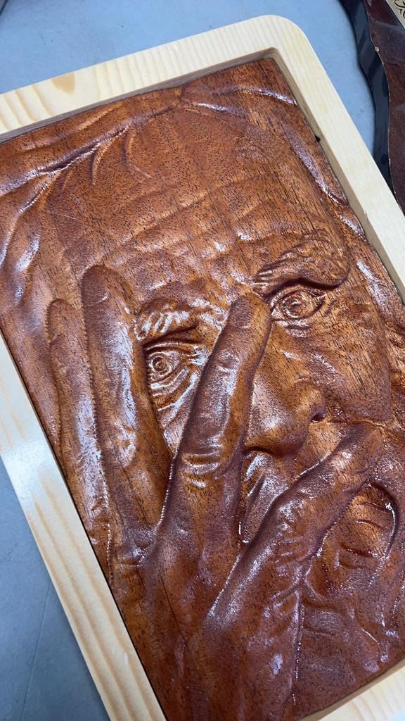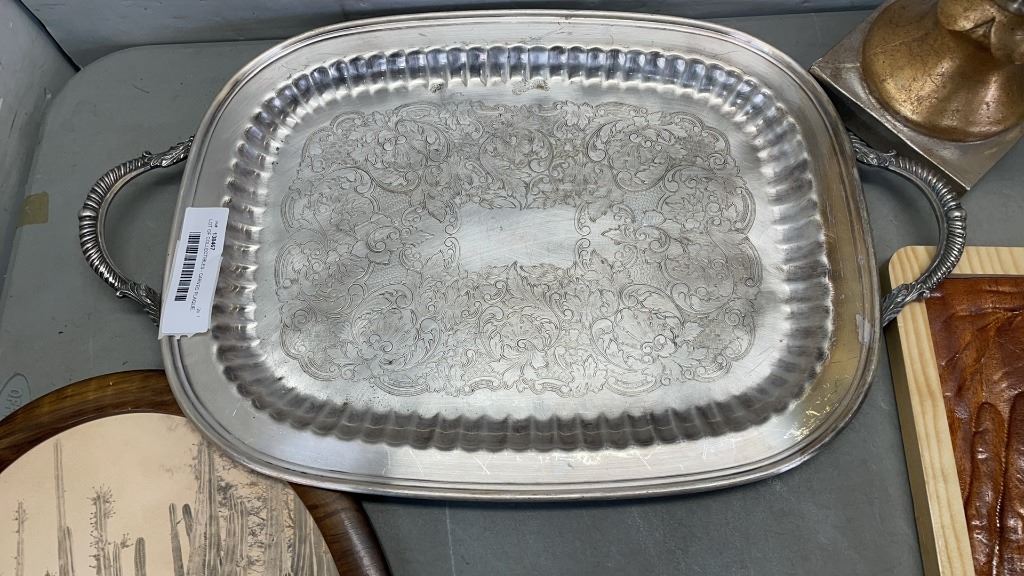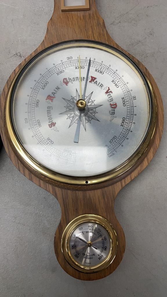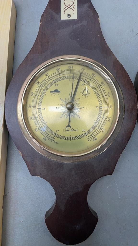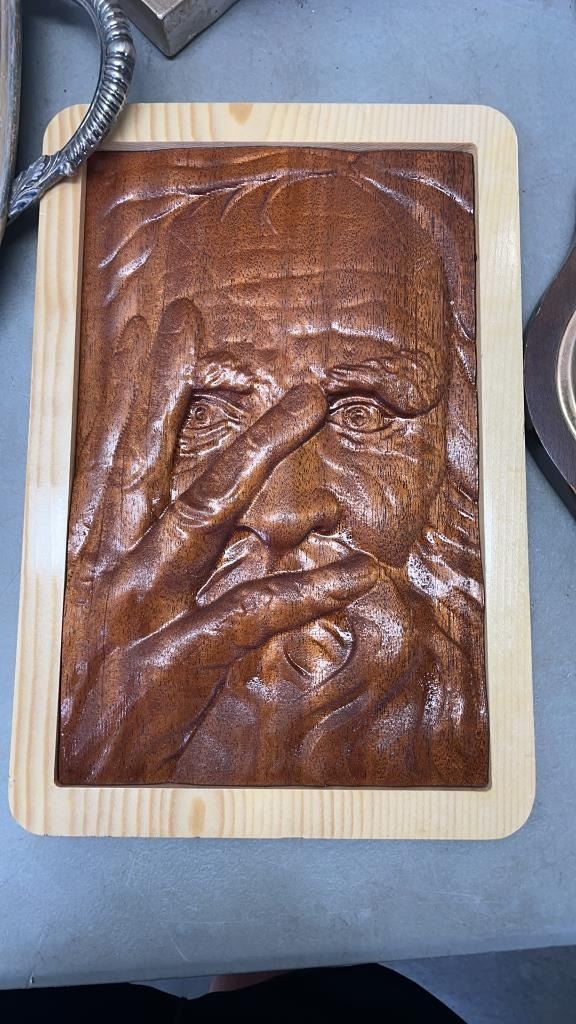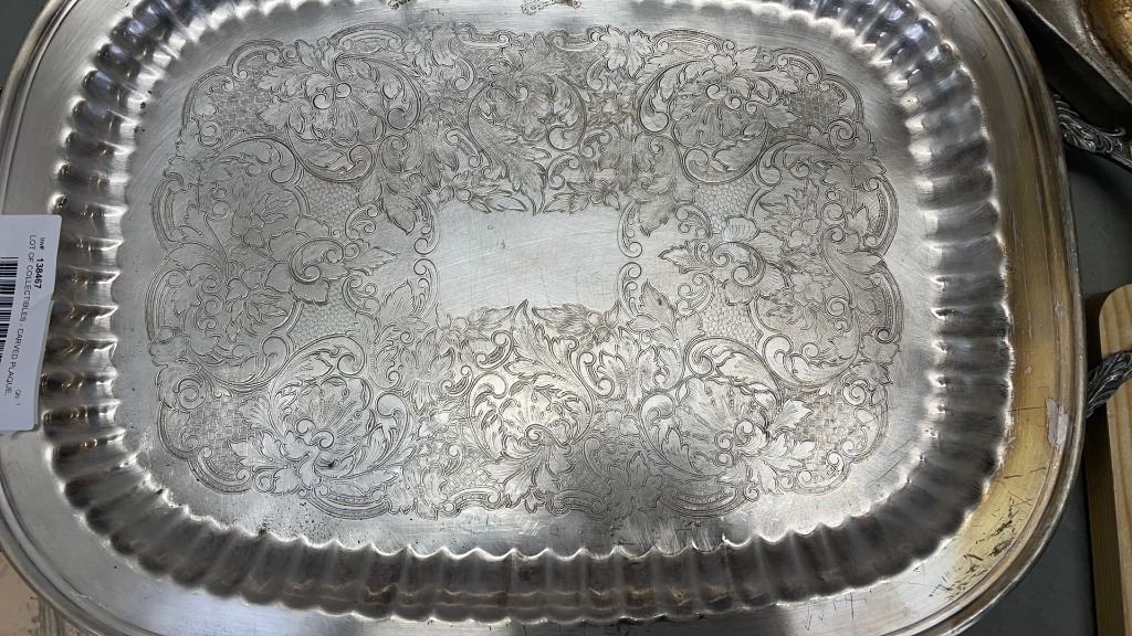 LOT OF COLLECTIBLES - CARVED PLAQUE, EGG STATUE, BAROMETERS, SERVING TRAY AND MORE