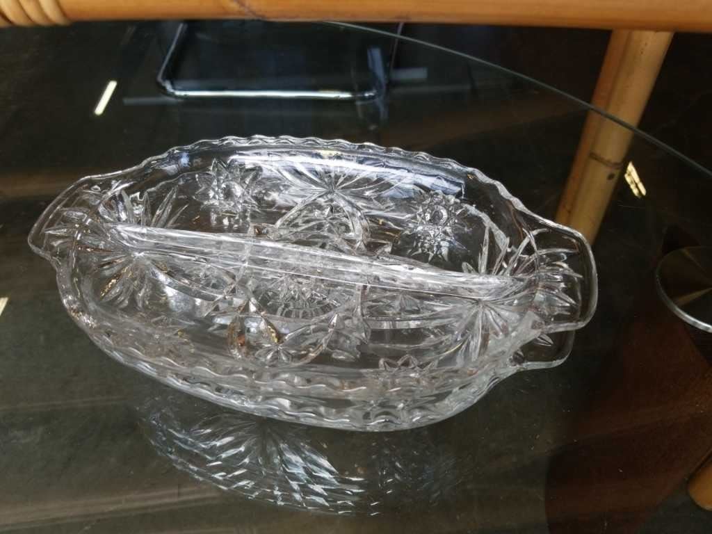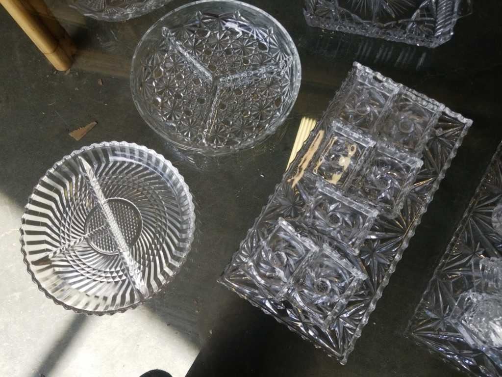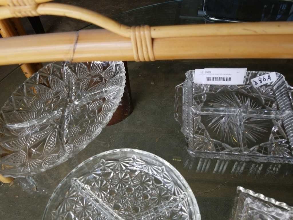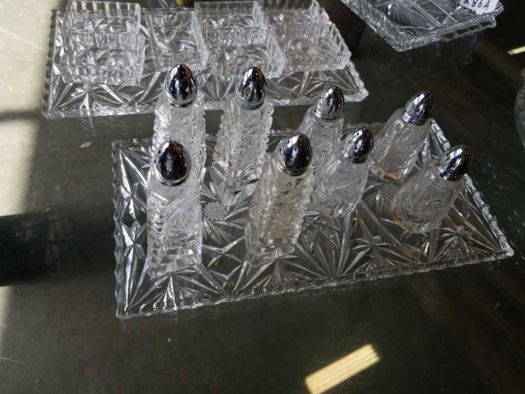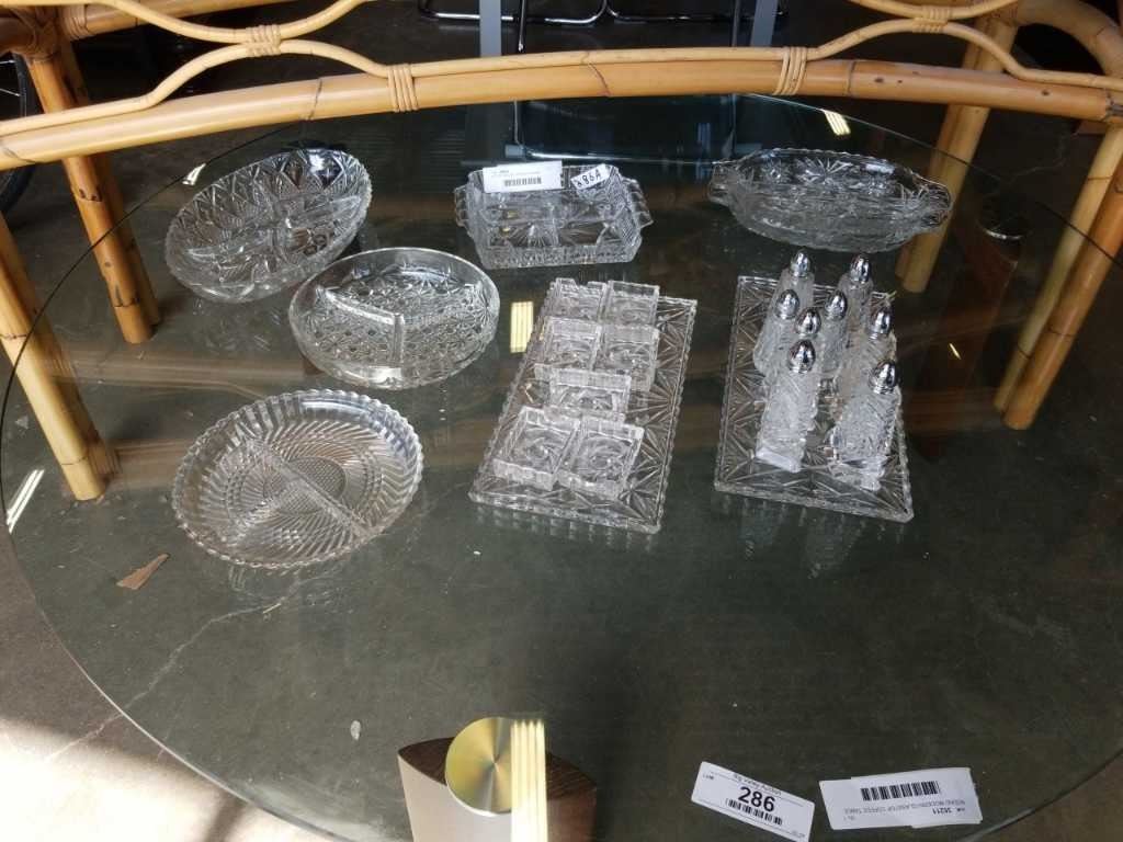 LOT OF CRYSTAL DIVIDED SERVING DISHES, SALT AND PEPPERS, ETC