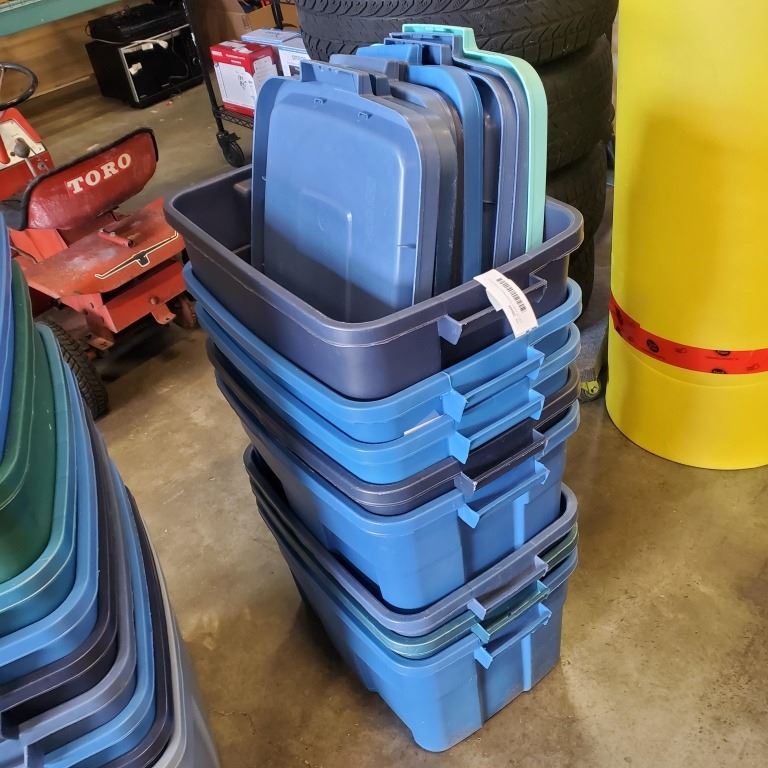 LOT OF EIGHT RUBBERMAID TOTES WITH LIDS