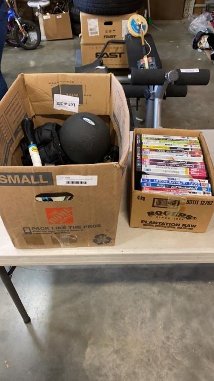 LOT OF EXECERSIZE EQUIPMENT, MEDICINE BALL, DUMBBELLS, EXCERSIZE BANDS AND MORE WITH VIDEOS