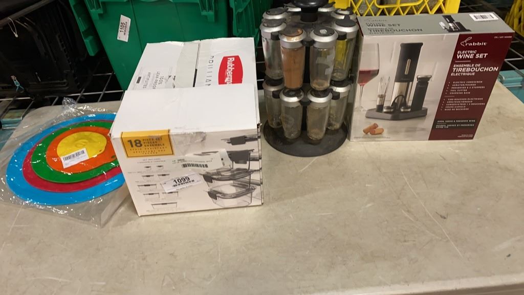 LOT OF GLASS LOCK CONTAINERS, SPICE RACK, SILICONE LIDS, AND ELECTRIC WINE SET