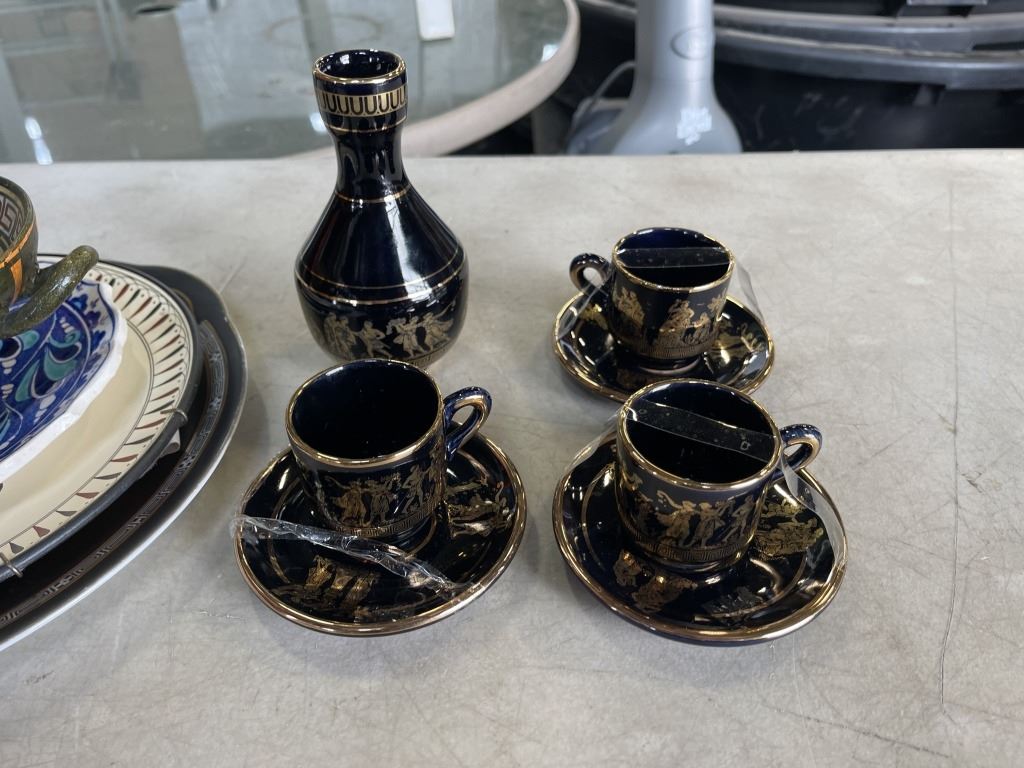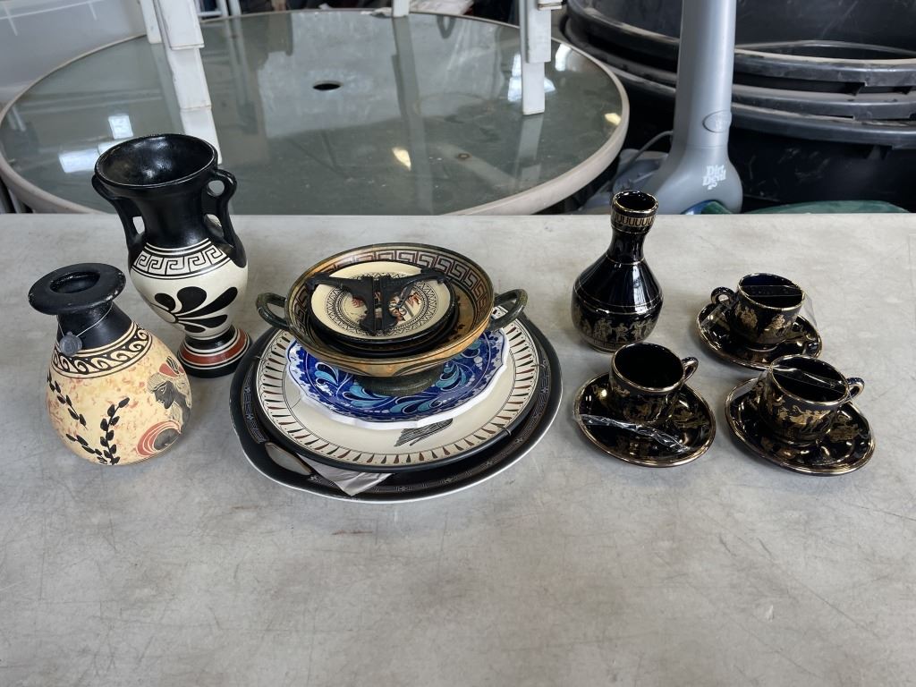LOT OF GREEK POTTERY ANDCUPS AND SAUCERS