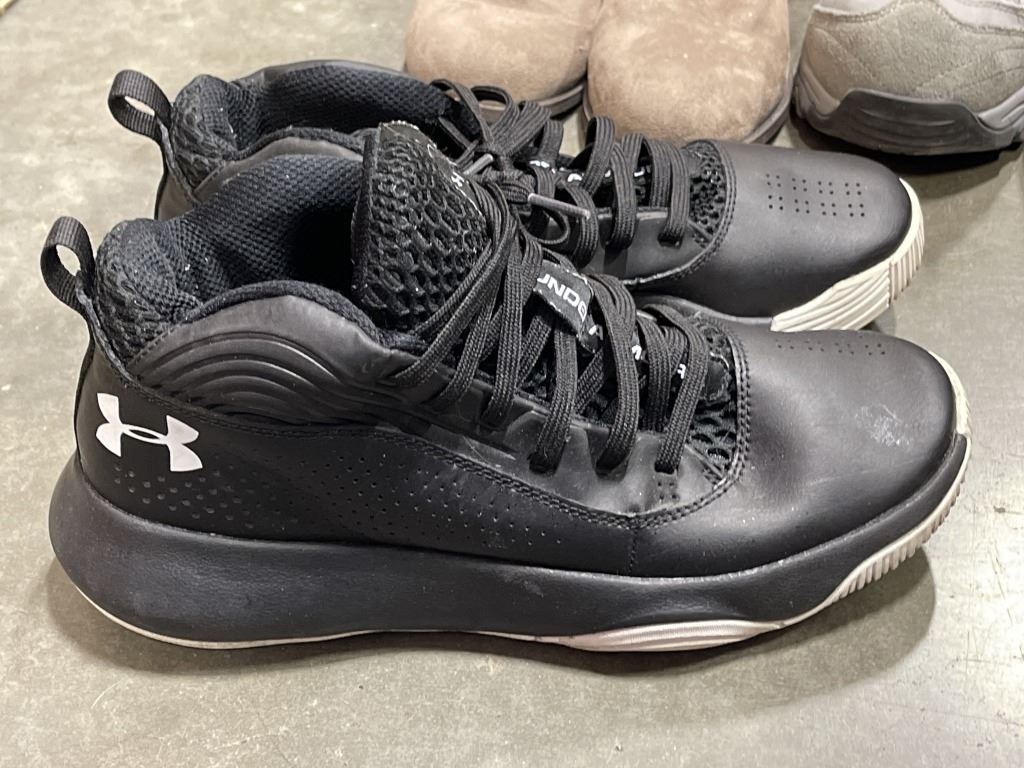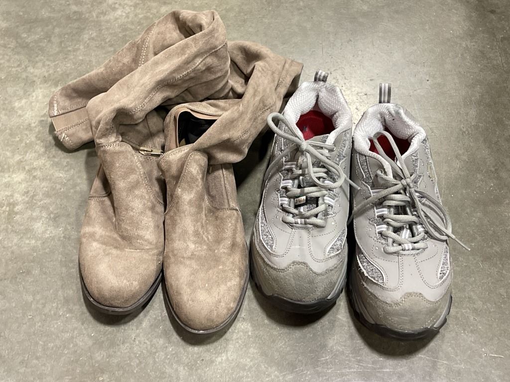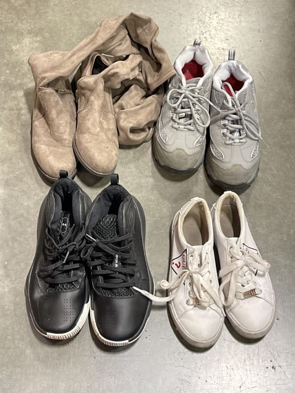 LOT OF GUESS SIZE 7.5, UNDER ARMOUR SIZE 8, SKETCHERS SIZE 7 STEEL TOE SHOES WITH CHINESE LAUNDRY KNEE HIGH BOOTS