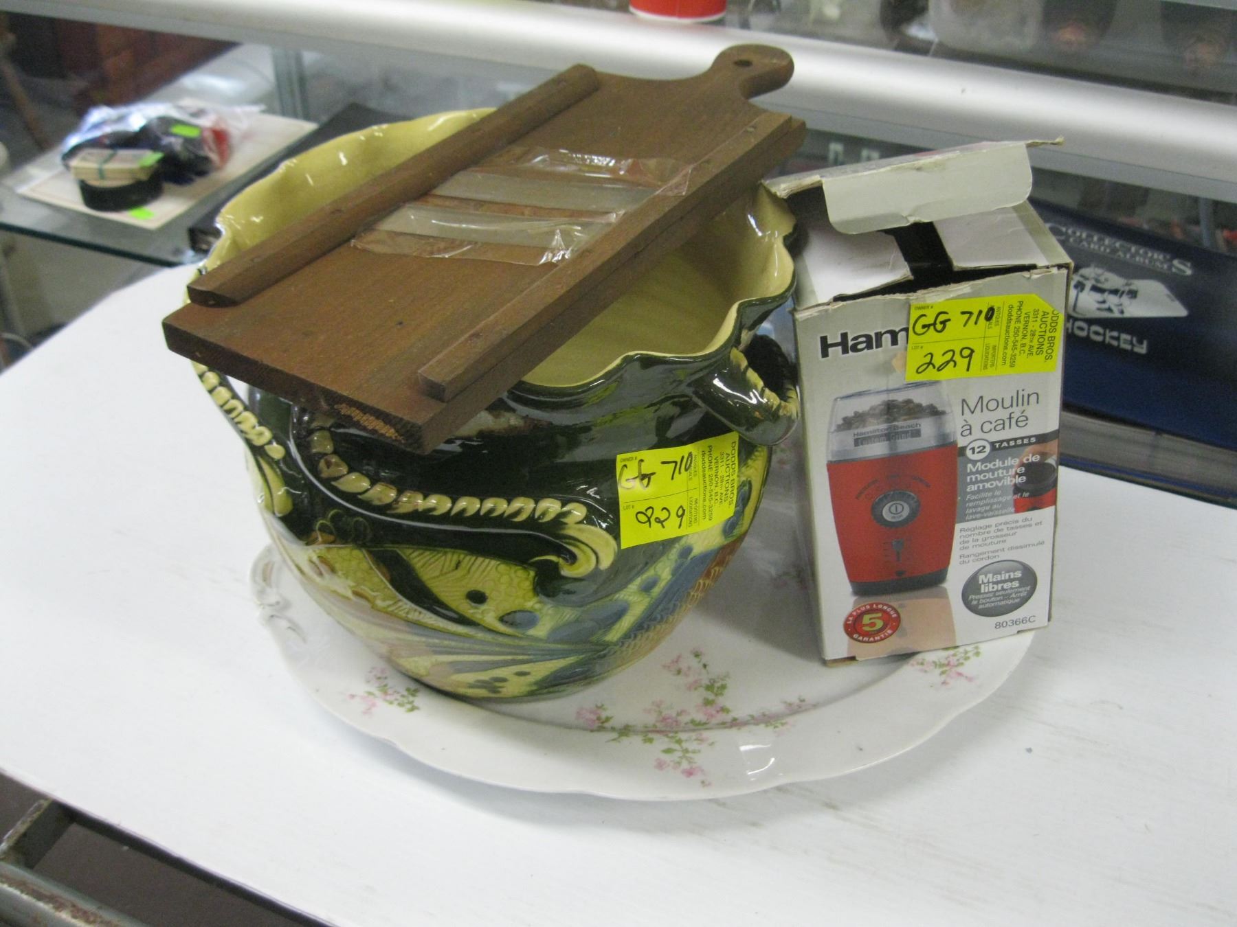 LOT OF HAMILTON BEACH COFFEE GRINDER, POTTERY VASE, PLATTER & SHREDDER