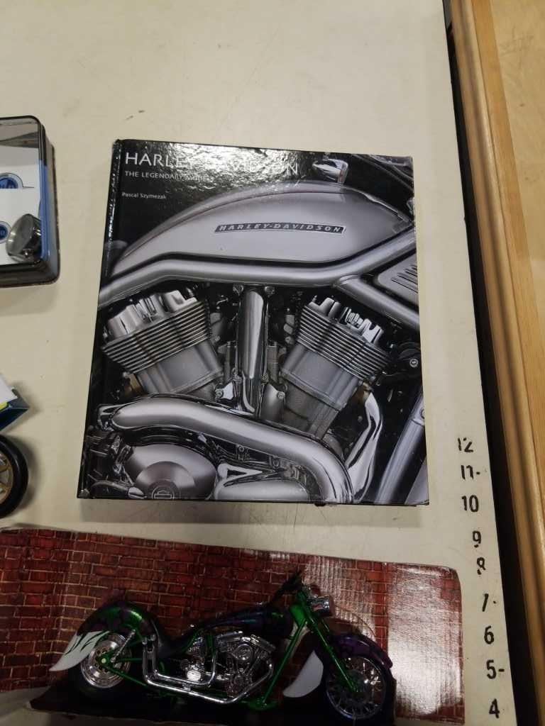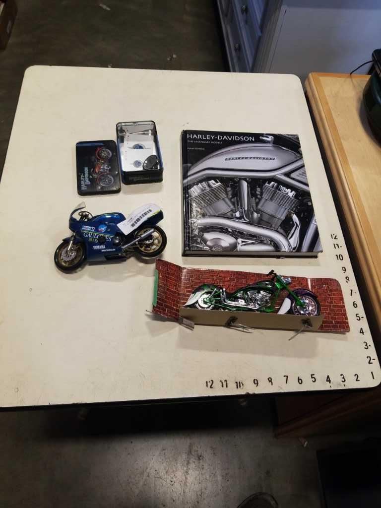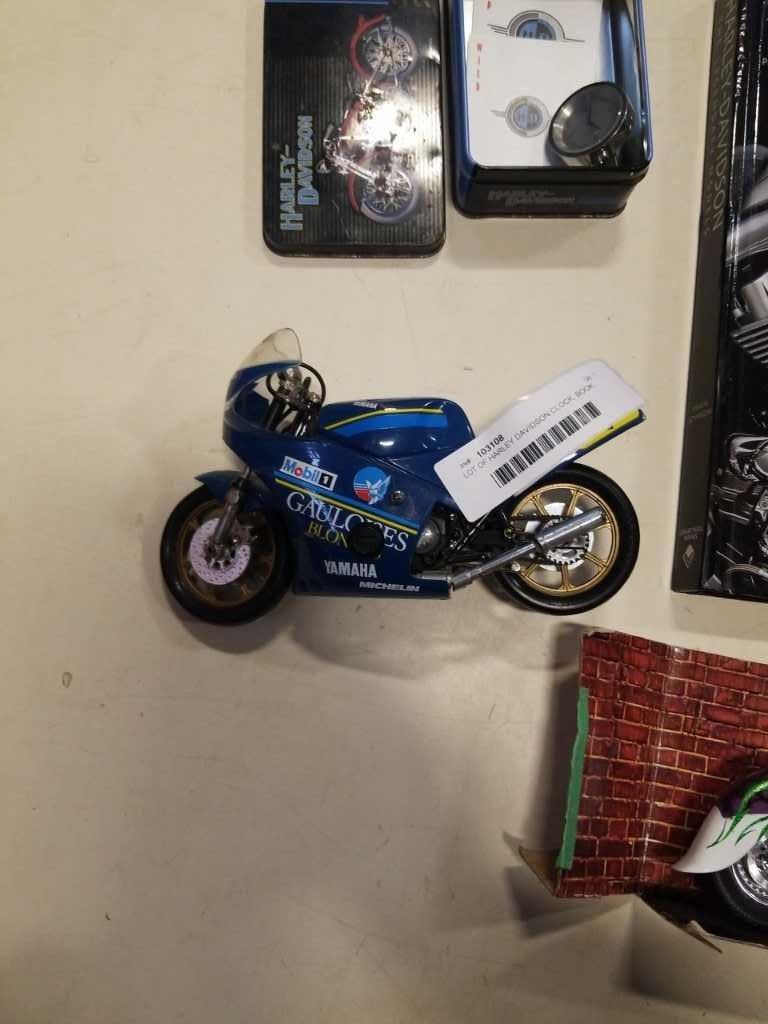 LOT OF HARLEY DAVIDSON CLOCK, BOOK, WILD CARDS AND TIN WITH 2 MOTORCYCLES