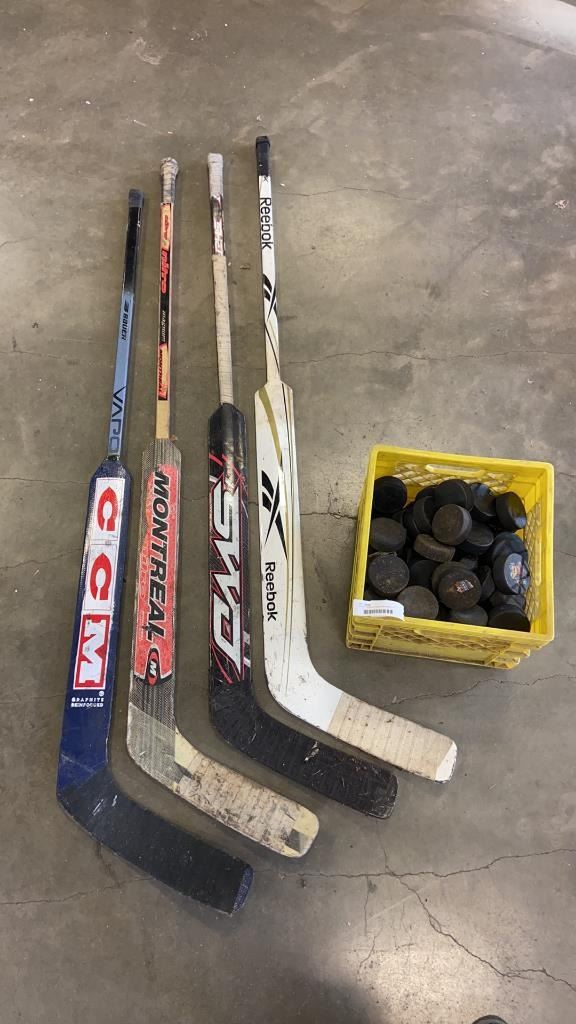LOT OF HOCKEY STICKS AND CRATE OF PUCKS