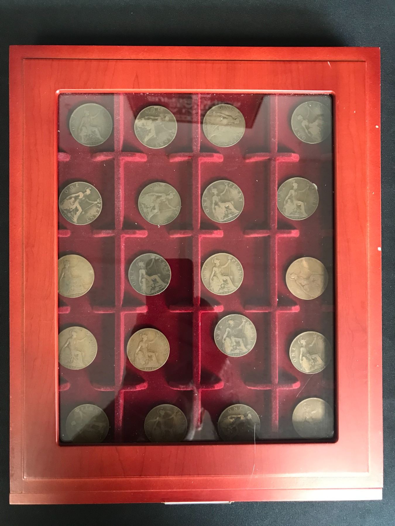 LOT OF HUNDRED YEAR OLD PENNIES WITH DISPLAY CASE