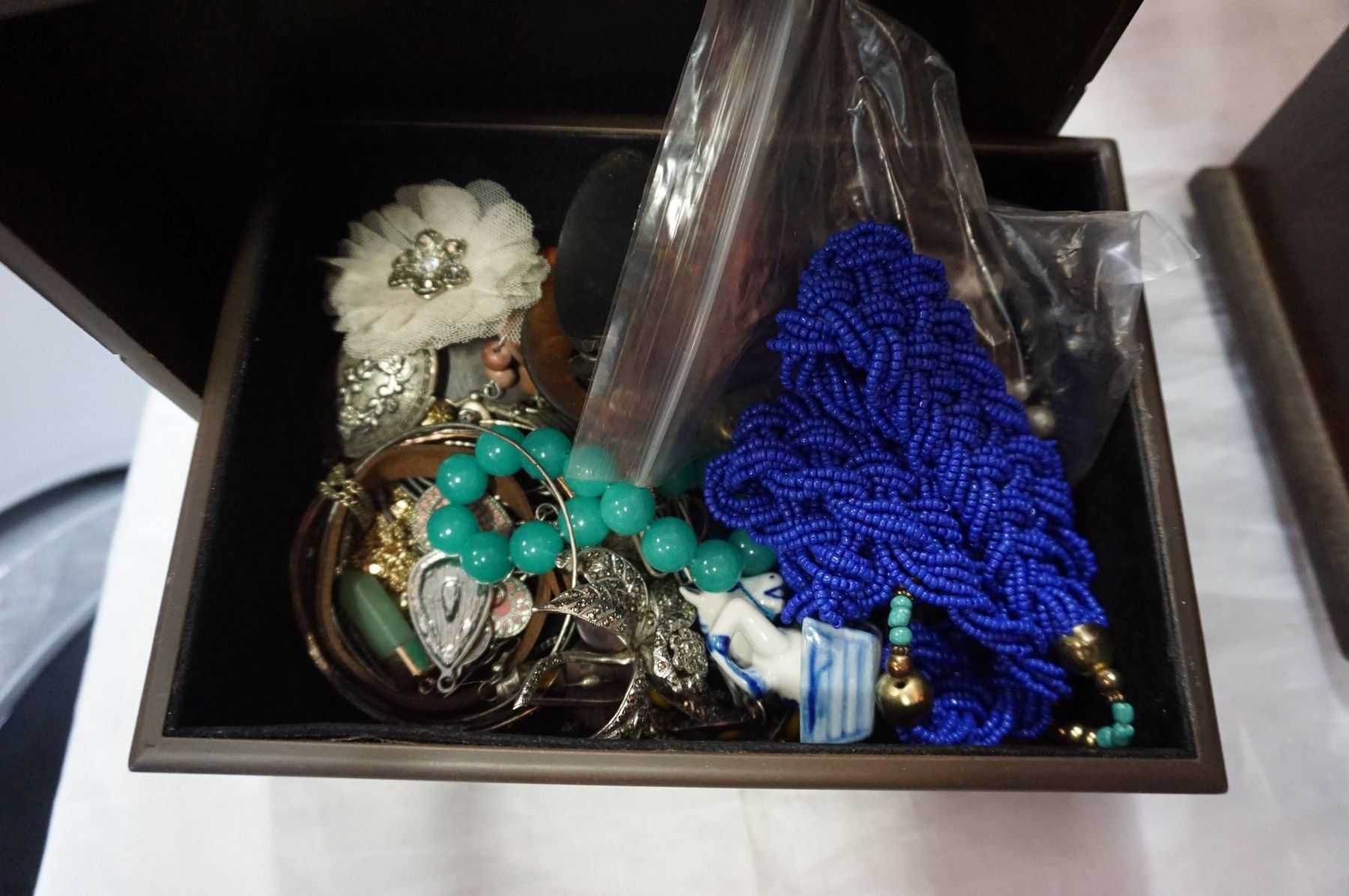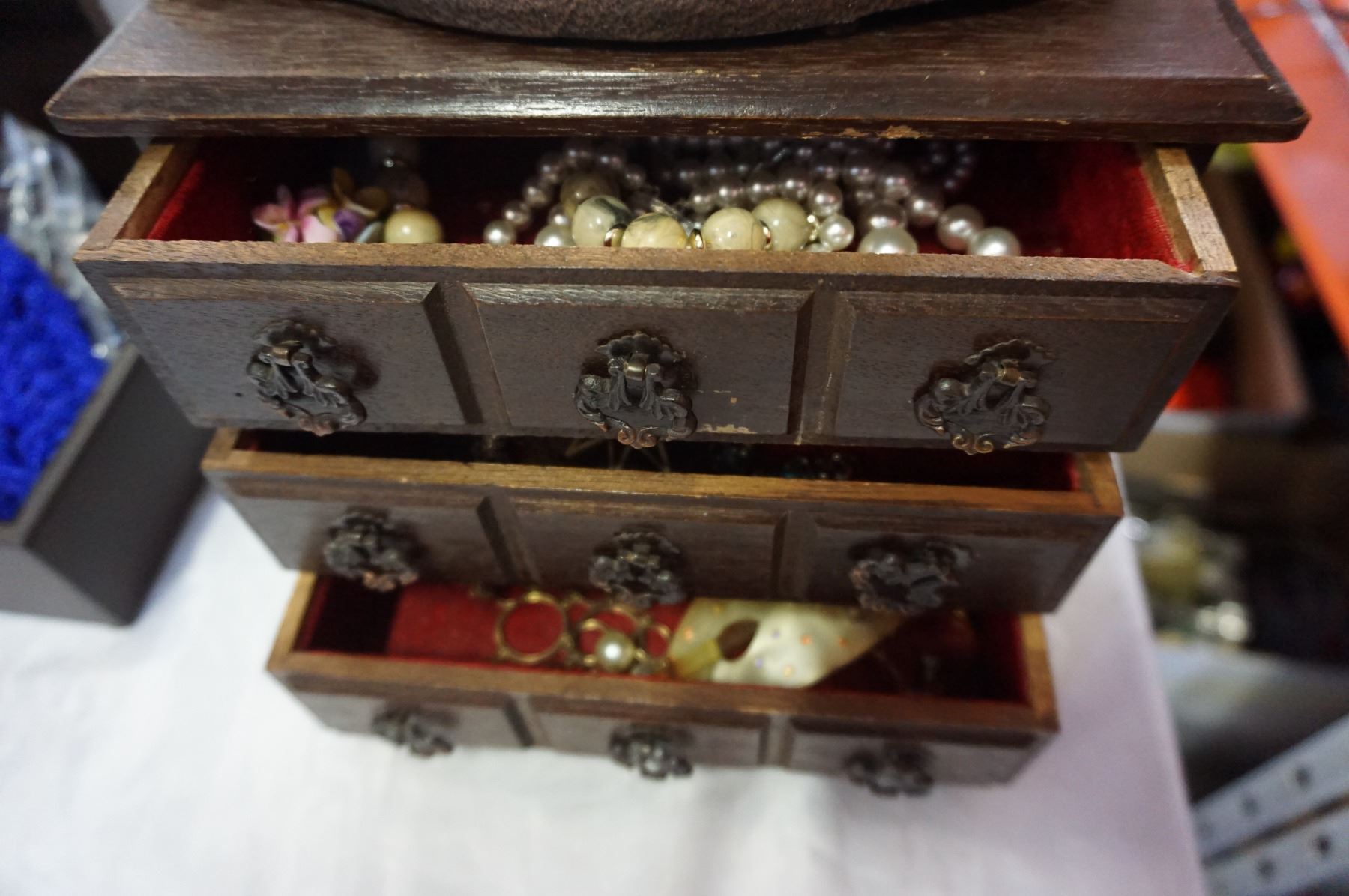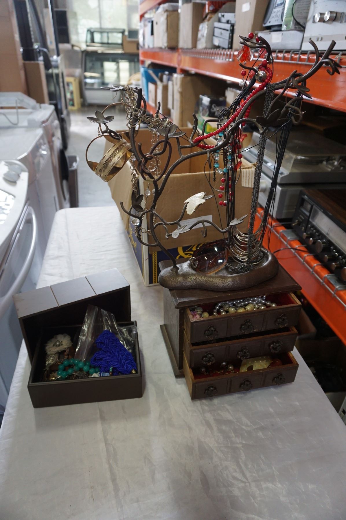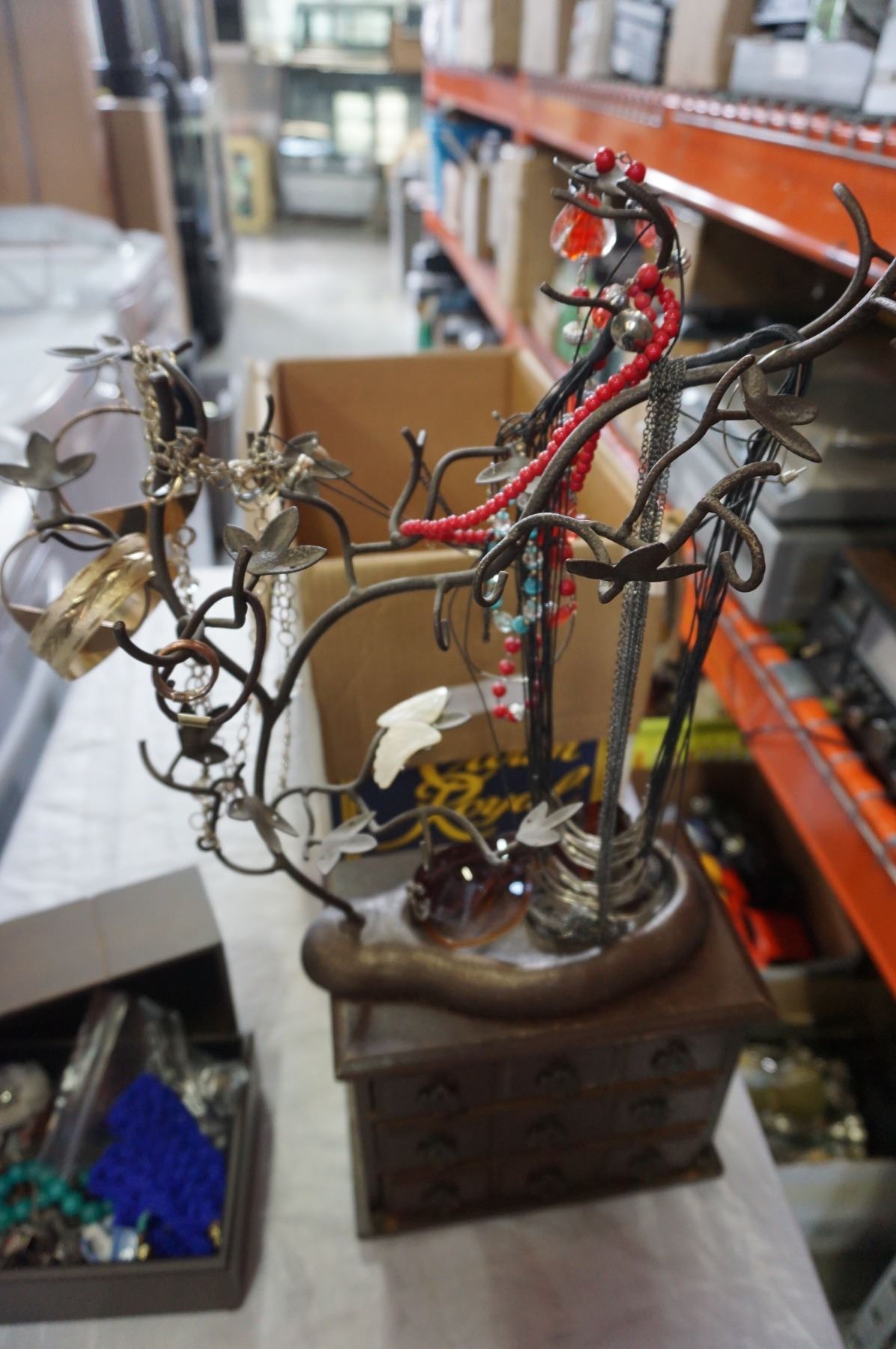 LOT OF JEWELLERY, JEWELLERY BOX, AND NECKLACE TREES