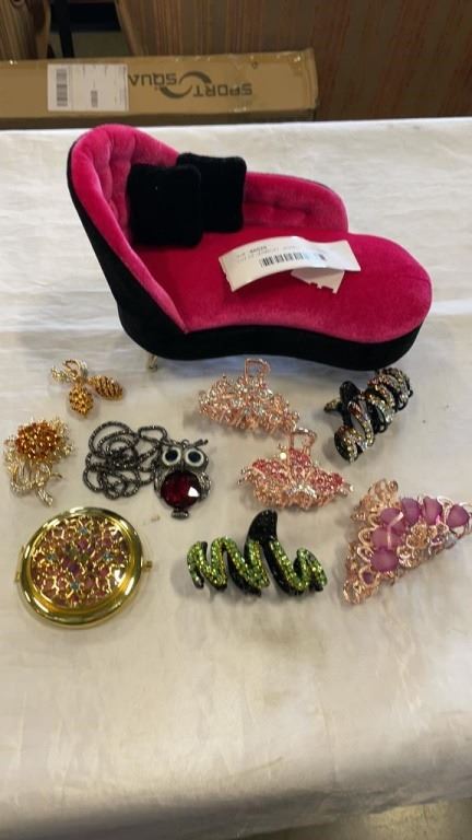 LOT OF JEWELRY, JEWELRY BOX, PINS, POCKET MIRROR