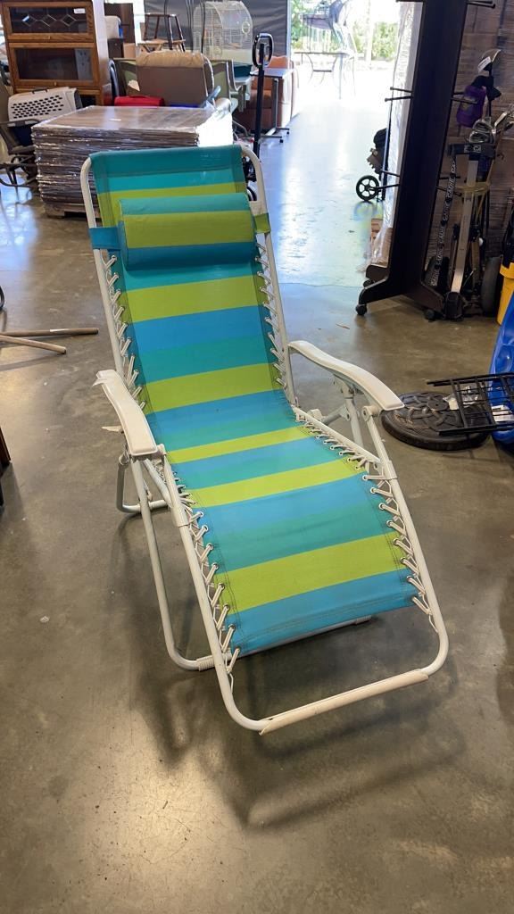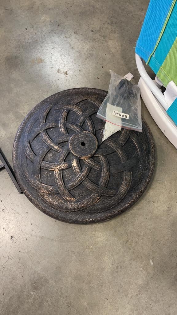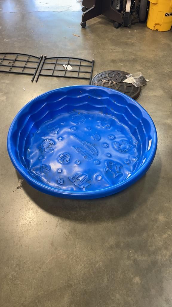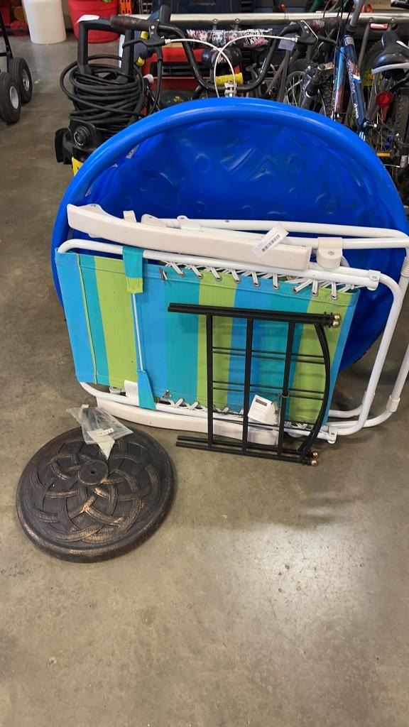 LOT OF KIDDIE POOL, FOLDING LOUNGE CHAIR, GARDEN FENCING AND WEIGHTED UMBRELLA STAND WITH BOLT