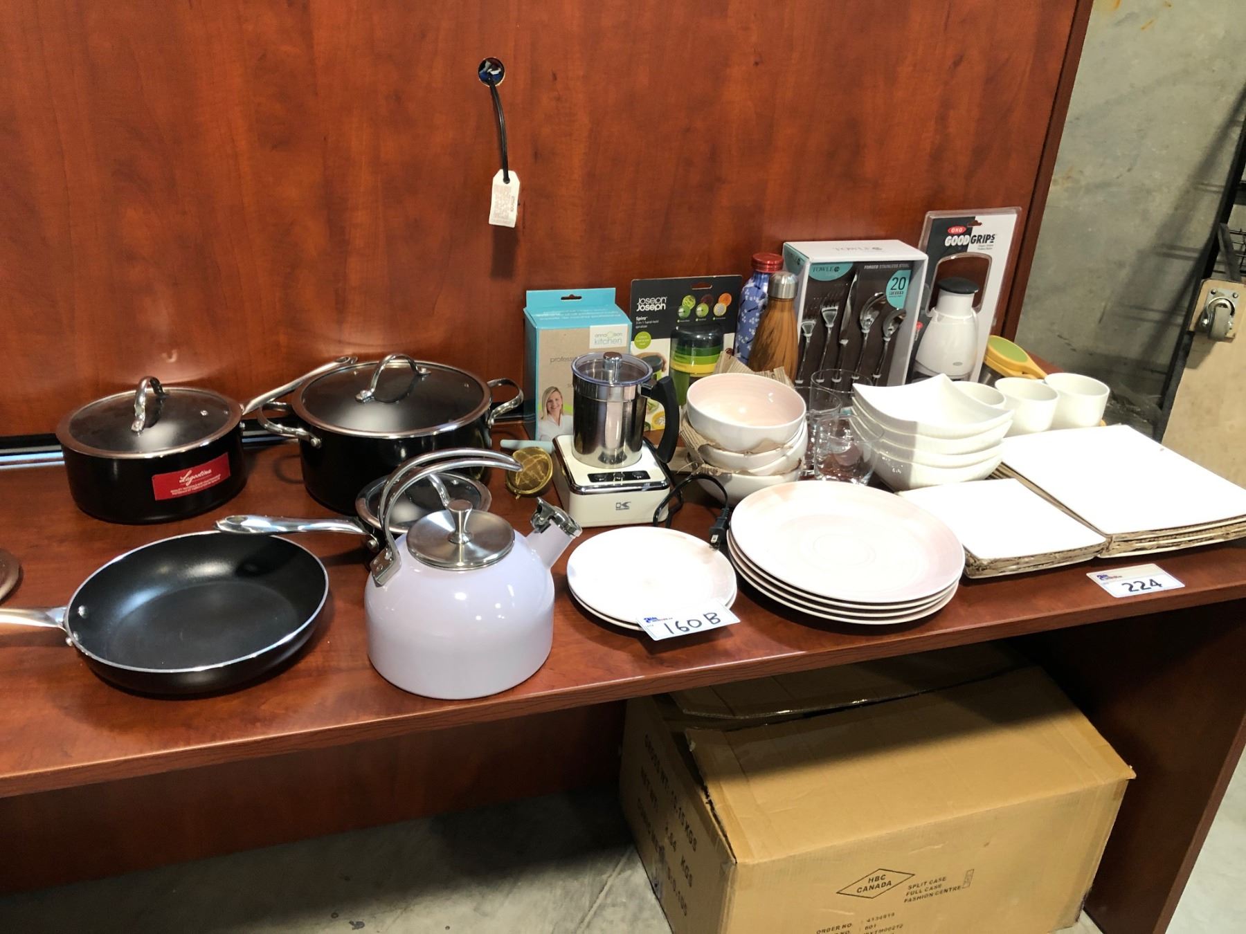 LOT OF KITCHENWARE INCLUDING KTE SPADE KETTLE, LAGOSTINA PATS AND PAN, LALORIKJ MILK FROTHER , ANNA OLSON TORCH, DISHES AND MORE