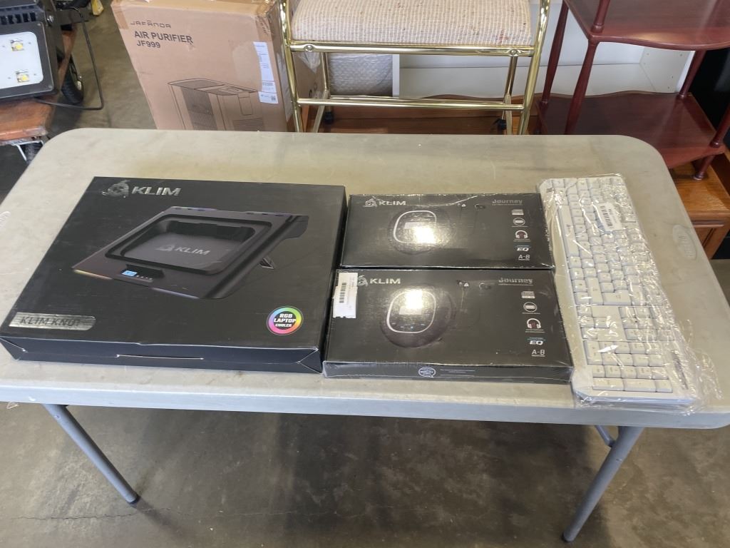 LOT OF KLIM COMPUTER ACCESSORIES - LAPTOP COOLER, KEYBOARD, AND 2 NEW/SEALED COMPACT DISC PLAYER W/
