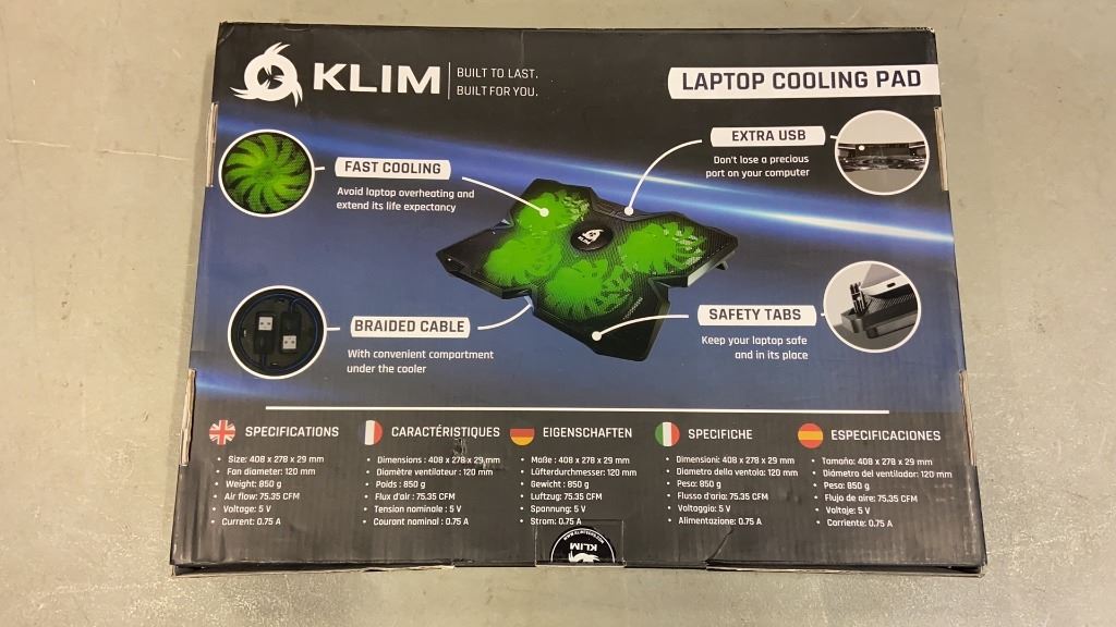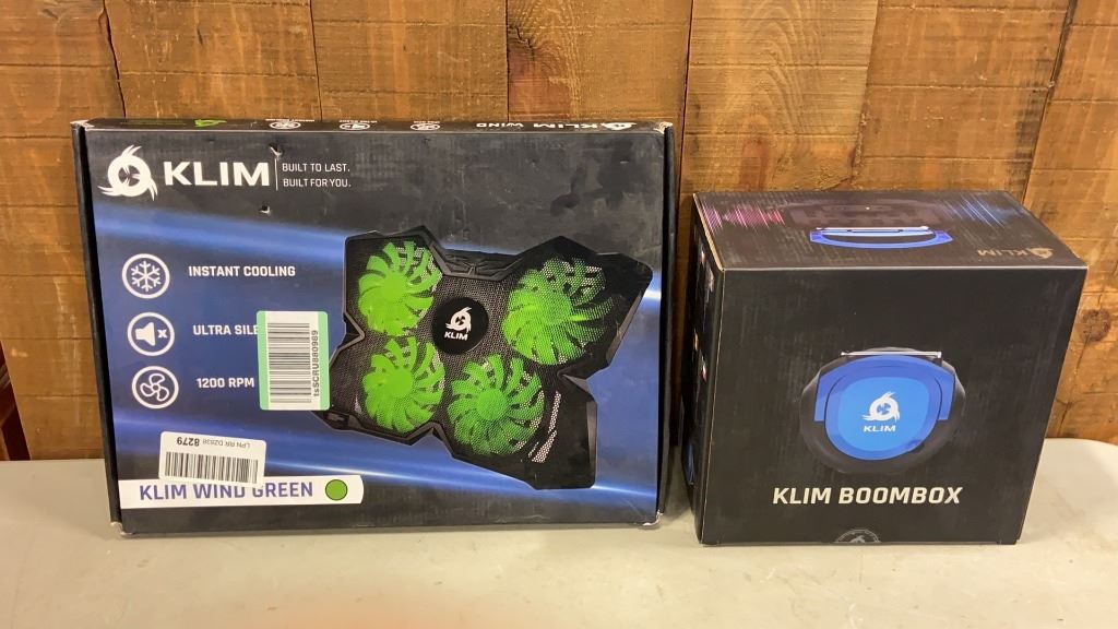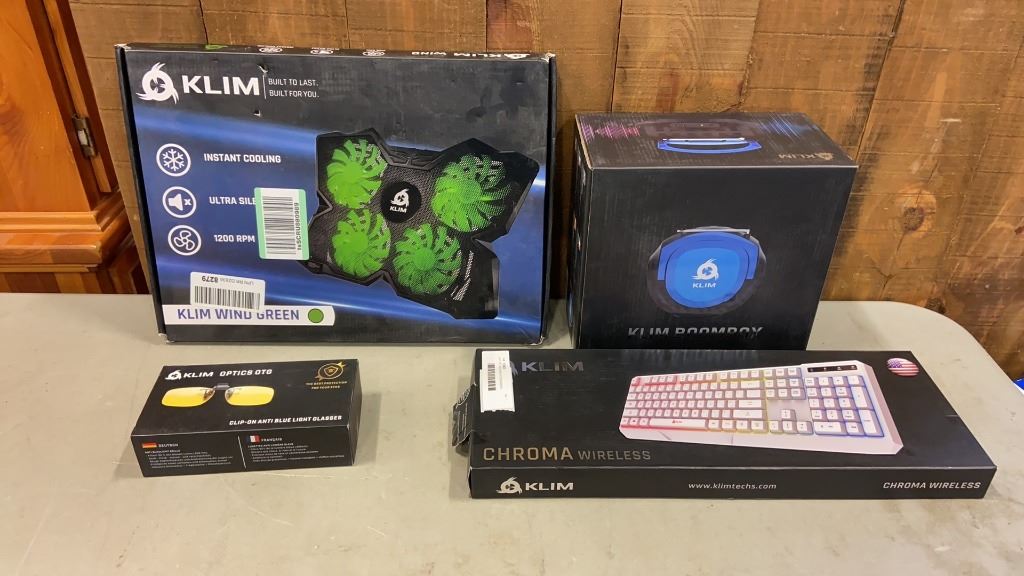 LOT OF KLIM GAMING ACCESSORIES - KEYBOARD, BOOM BOX, LAPTOP COOLER, ETC