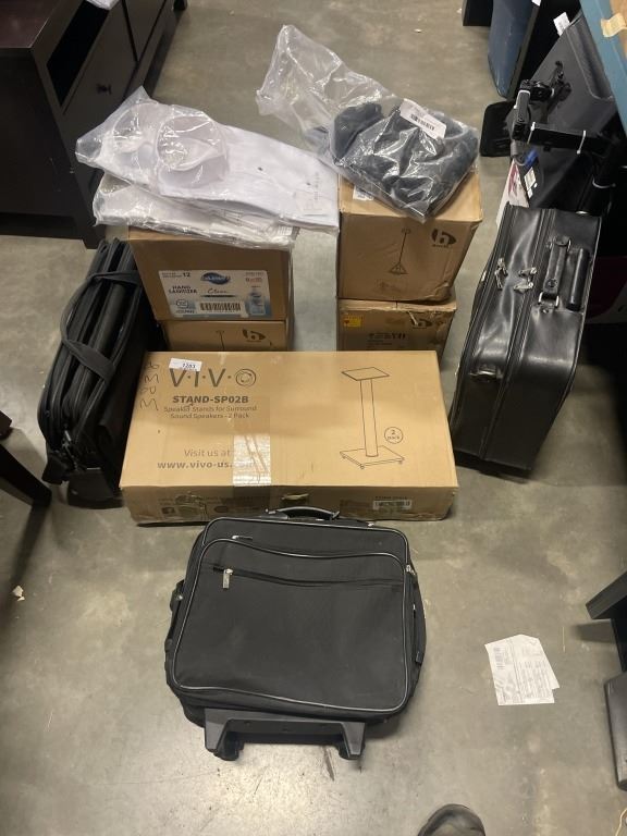LOT OF LIGHTS, HAND SANITIZER, SPEAKER STANDS AND LUGGAGE