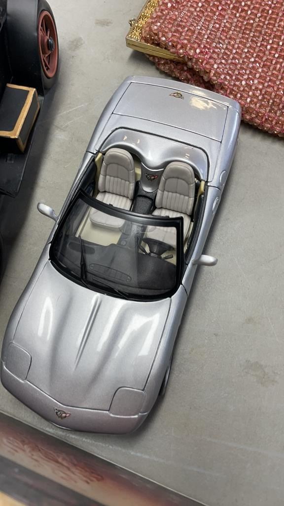 LOT OF METAL VEHICLE, WITH DIE CAST VEHICLE, BUDWEISER COLLECTIBLE, CLAY WINE CHILLER AND BEADED PURSE