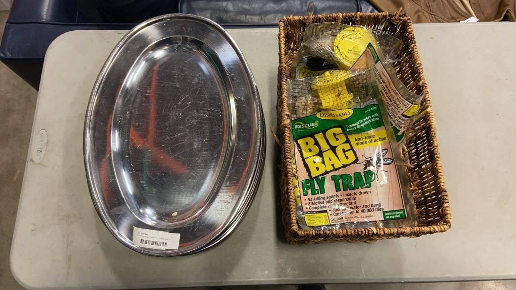 LOT OF NEW BIG BAG FLY TRAPS, AND 14 STAINLESS SERVING PLATTERS