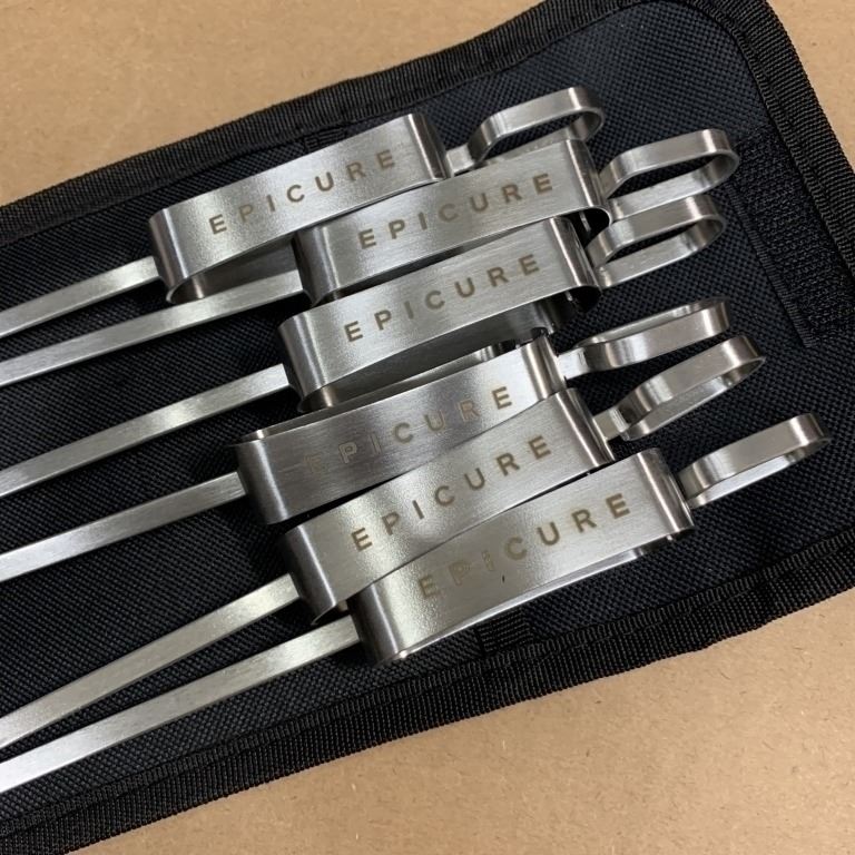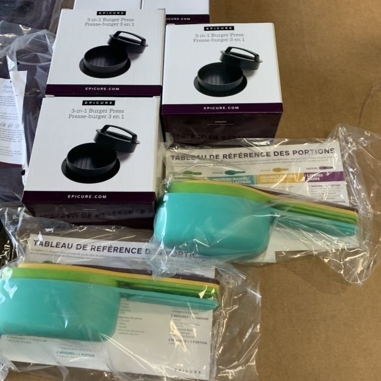 LOT OF NEW EPICURE COOKING SUPPLIES PERFECT 4 OMELETTE MAKERS, PETITES SILICONE BAKING SHEET, 3 BUREGER PRESSES, 2 STAINLESS 2 TBSP SCOOPS, 2 SETS OF PERFECT PORTION SCOOPS AND GRILL BOSS SKEWERS