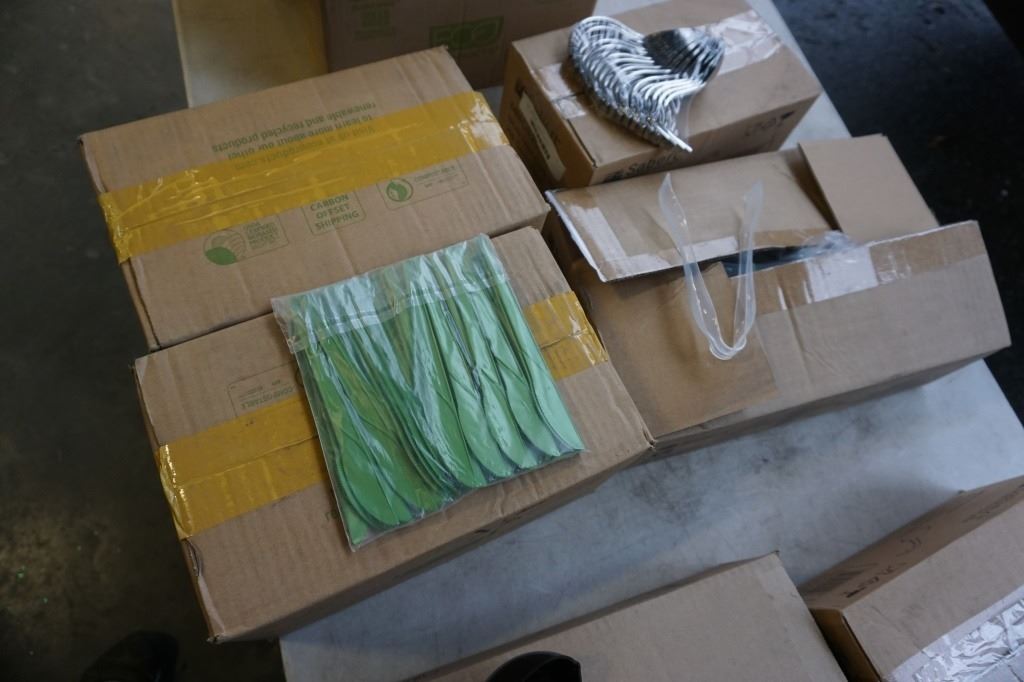 LOT OF NEW GREEN PLASTIC COMPOSTIBLE KNIVES, SILVER LOOK CURLY SPOONS AND CLEAR PLASTIC TONGS