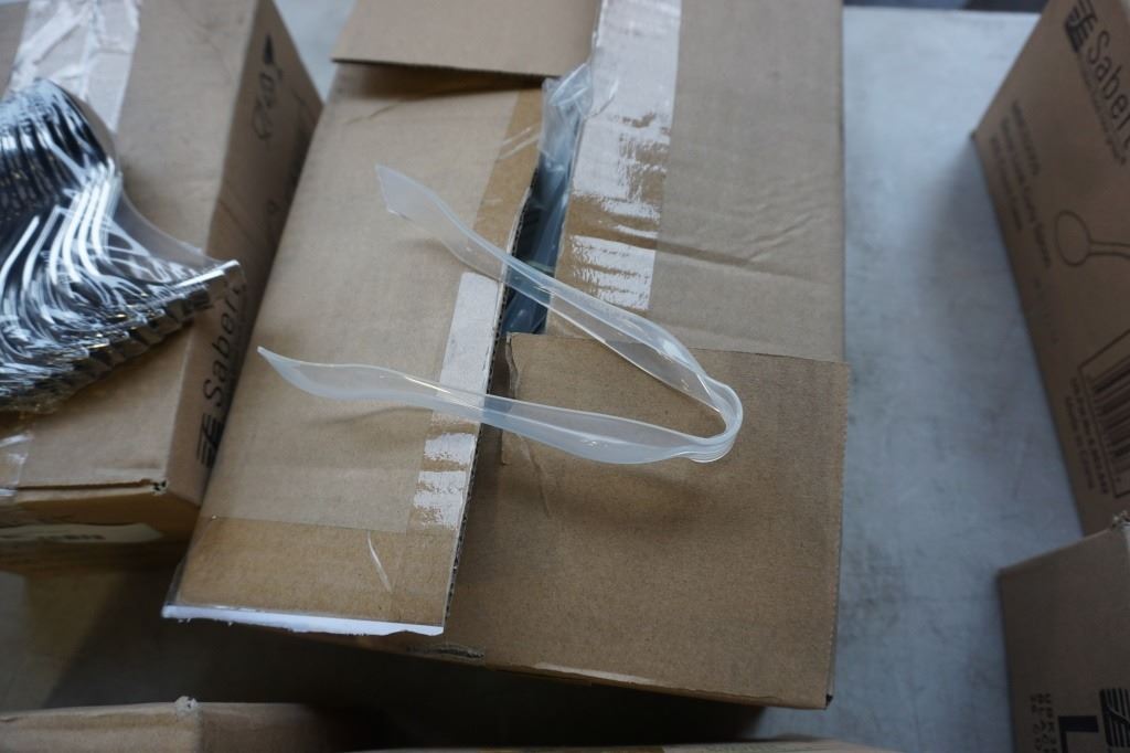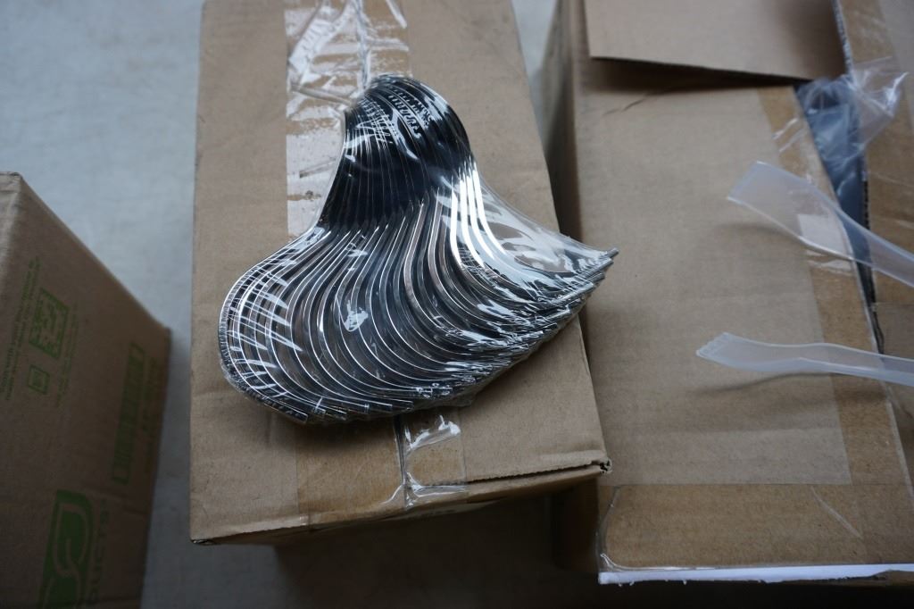LOT OF NEW GREEN PLASTIC COMPOSTIBLE KNIVES, SILVER LOOK CURLY SPOONS AND CLEAR PLASTIC TONGS