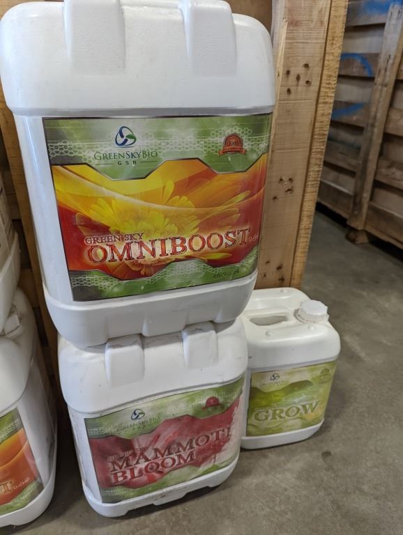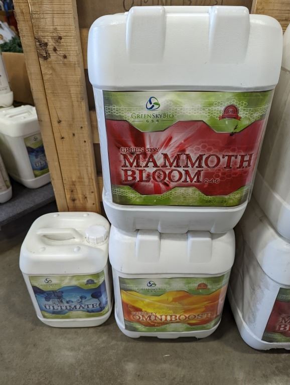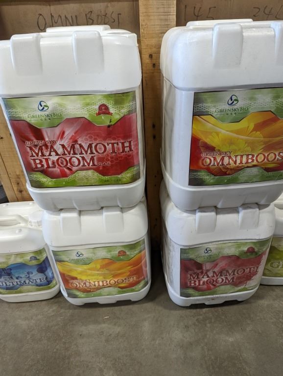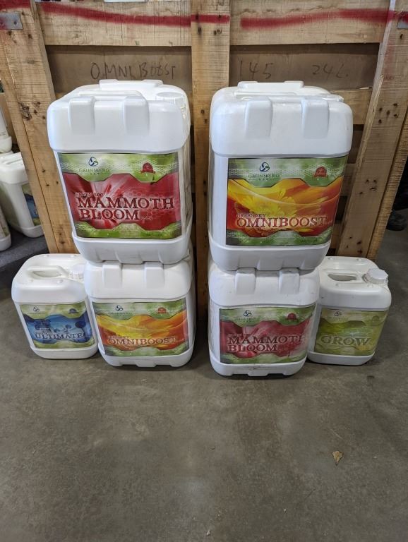 LOT OF NEW LIQUID FERTILIZER 2 MAMMOTH BLOOM (24L), 2 OMNIBOOST (24L), 1 ULTIMATE (10L) AND 1 GROW (10L)
