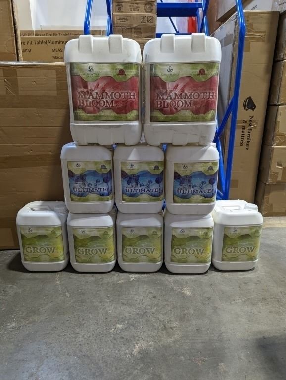 LOT OF NEW LIQUID FERTILIZER 2 MAMMOTH BLOOM (24L), 3 ULTIMATE (10L) AND 5 GROW (10L)